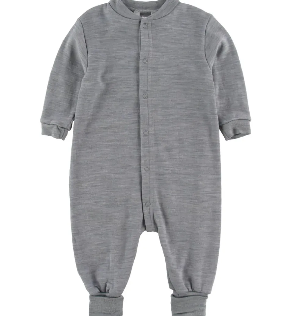 Den har lange ærmer og ben, lukkes med trykknapper fortil og har ombuk ved fødderne.