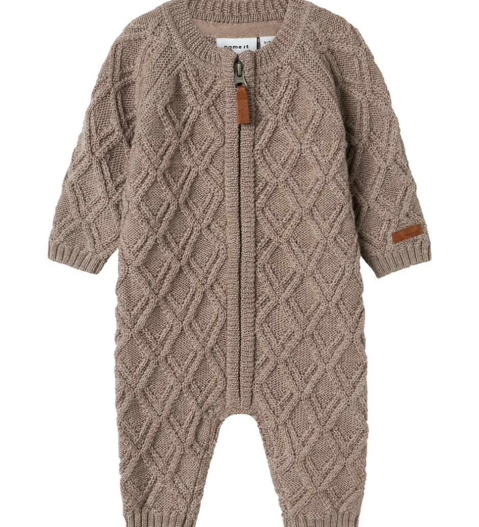 Flot Name It heldragt i lysebrun med et smukt strikket mønster.