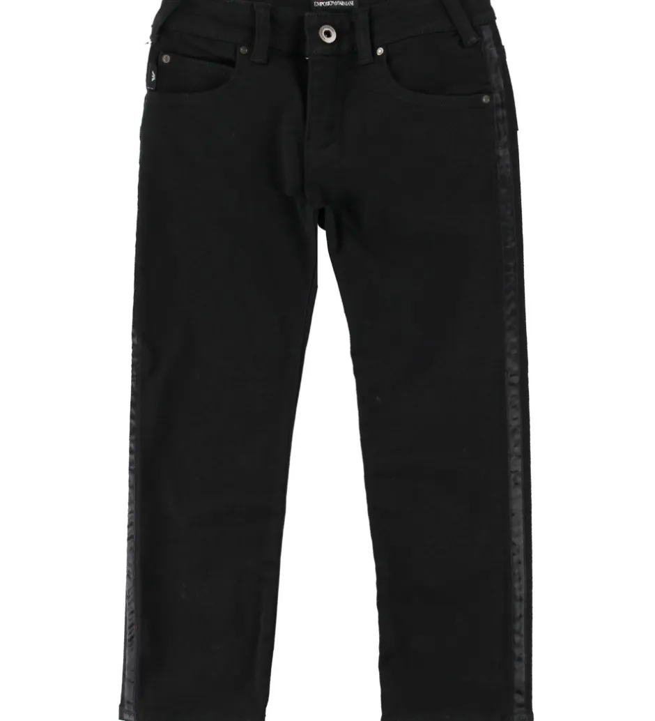 Lækre Emporio Armani jeans i ensfarvet sort og i en strækbar kvalitet. I siderne er der ned langs buksebenene en smal sort kant i glatvævet kvalitet.