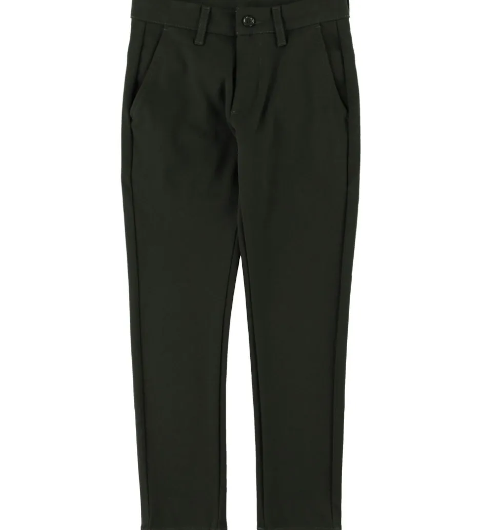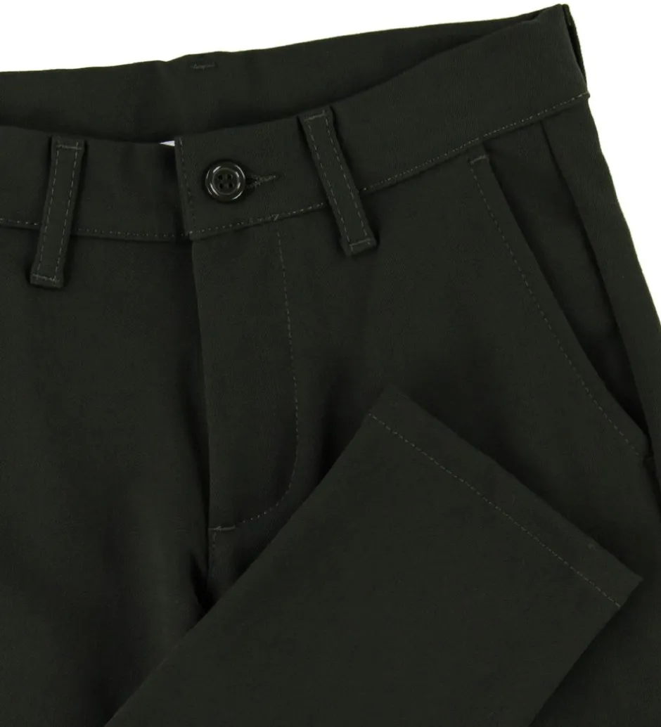 Grunt bukserne har lange ben, og de har indvendige justerbar elastikkanter og bæltestropper i livet. Bukserne åbnes fortil med knap og lynlås. Fortil har bukserne gode dybe lommer i hver side, og paspoleret lommer bagpå.