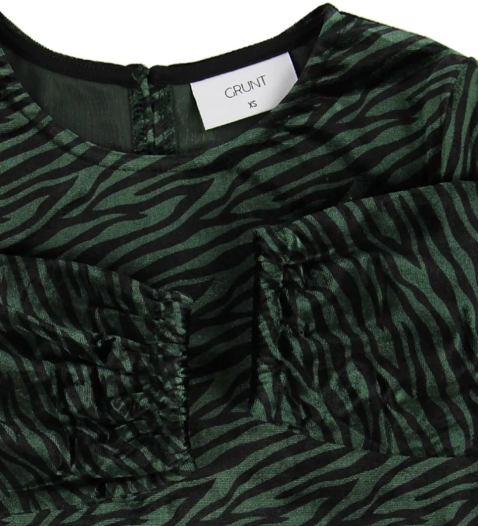 Smart Grunt kjole i mørkegrøn velour med allover sorte Zebra striber.