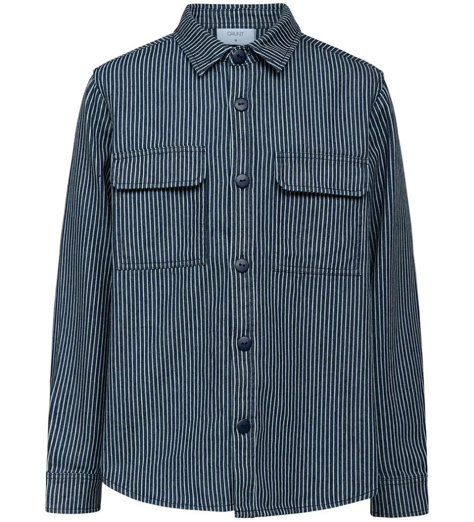 Grunt skjorten har lange ærmer og brede kanter med en enkelt knap. I halsåbningen er der en klassisk krave, og skjorten åbnes med navy knapper. Fortil sidder der to brystlommer med en klap.