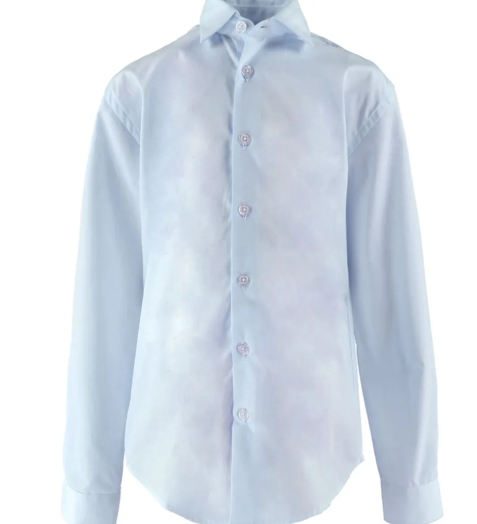 Grunt skjorten har lange ærmer med manchetknapper ved håndleddene. I halsåbningen er der en klassisk krave. Fortil åbnes skjorten med hvide knapper.