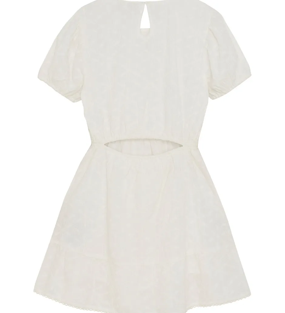 Skøn Indian Blue Jeans kjole i hvid med korte ærmer og et fint, broderet mønster. Kjolen har en feminin pasform, hvilket gør den til et alsidigt valg til forskellige anledninger. Kjolen er lavet i en let, fastvævet kvalitet, og den består af to lag, så den ikke fremstår gennemsigtig.