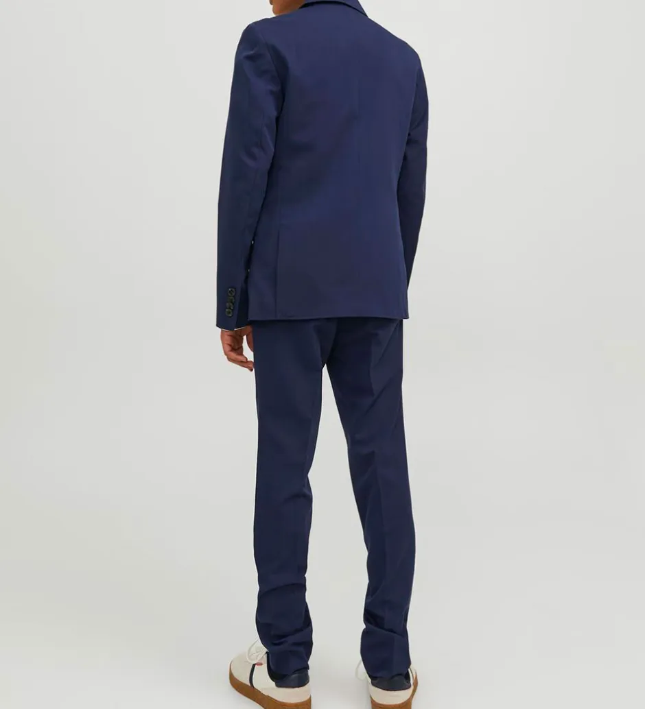 Elegant Jack & Jones jakkesæt i en dyb blå nuance med klassisk design. Jakkesættet omfatter en blazer med to knapper og matchende bukser, perfekt til festlige lejligheder.