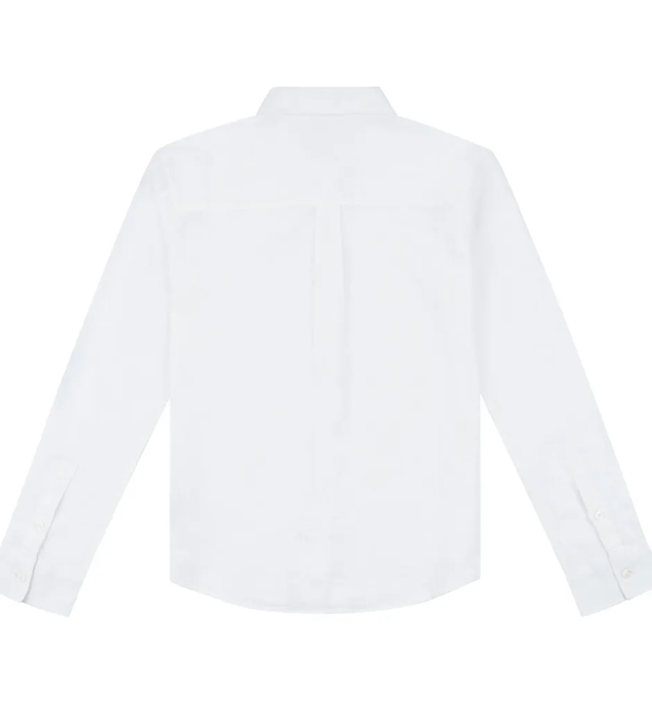 Fin Lyle & Scott skjorte i ensfarvet hvid med et lille, gult logo-patch fortil i venstre side.