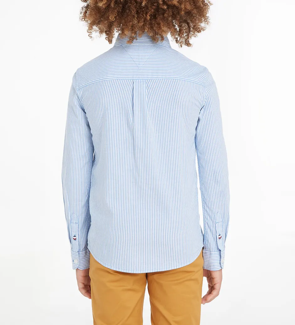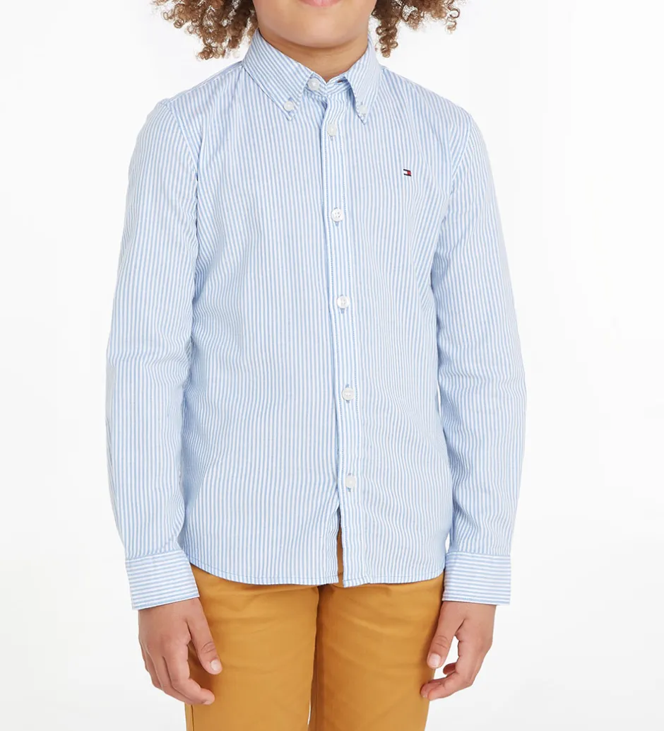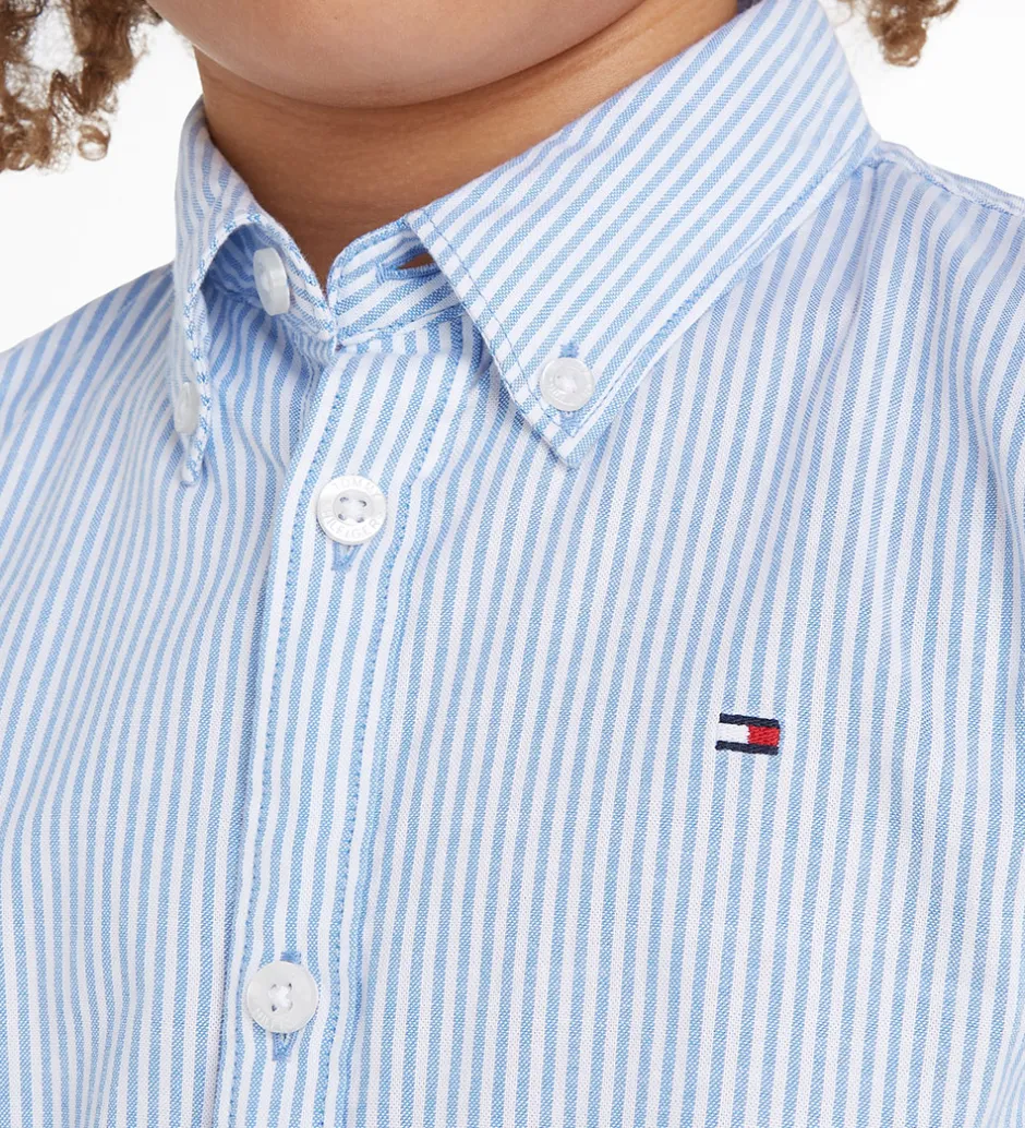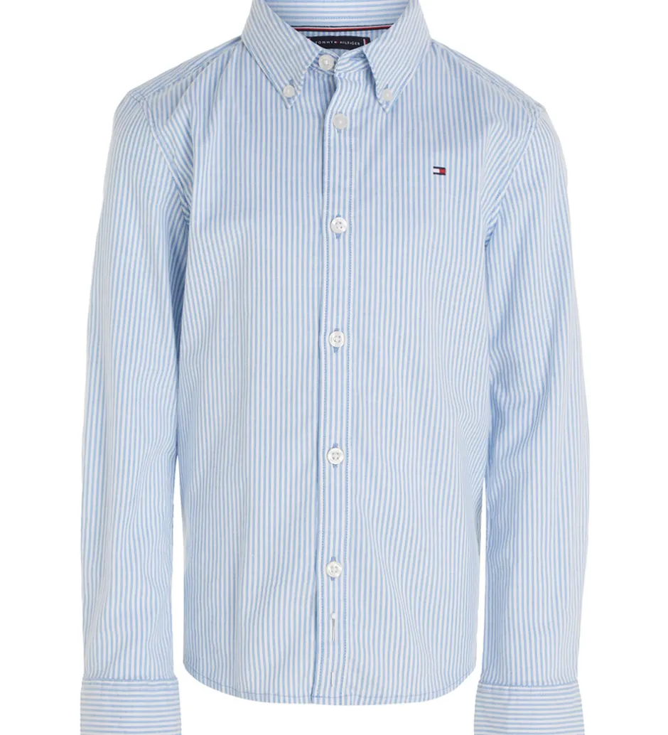 Smart Tommy Hilfiger skjorte i hvid med lodrette striber i lyseblå samt et lille Tommy Hilfiger-logo broderet i sort, hvid og rød på venstre bryst.