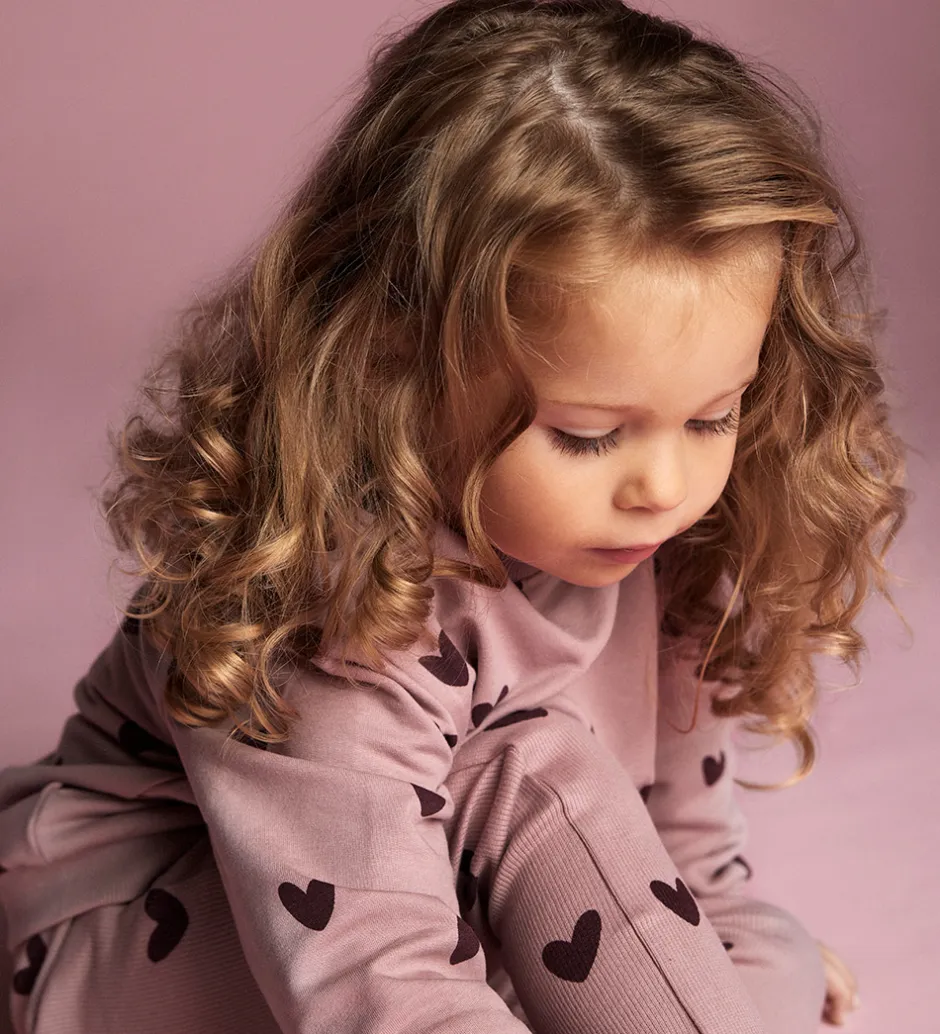 Charmerende Creamie leggings i en blød, rosa nuance med et sødt hjerteprint og ribstruktur. Creamie leggingsene har en elastisk kant i livet, der sikrer en god pasform hele dagen.