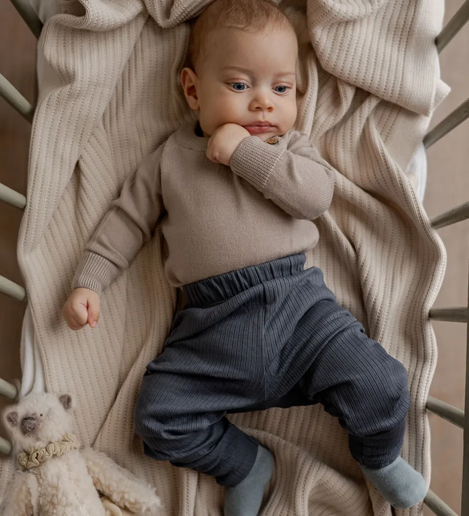 Stilfulde Hanevild leggings i en kølig blå farve med strikket ribstruktur. Hanevild leggingsene har en elastisk talje, der sikrer en behagelig pasform.