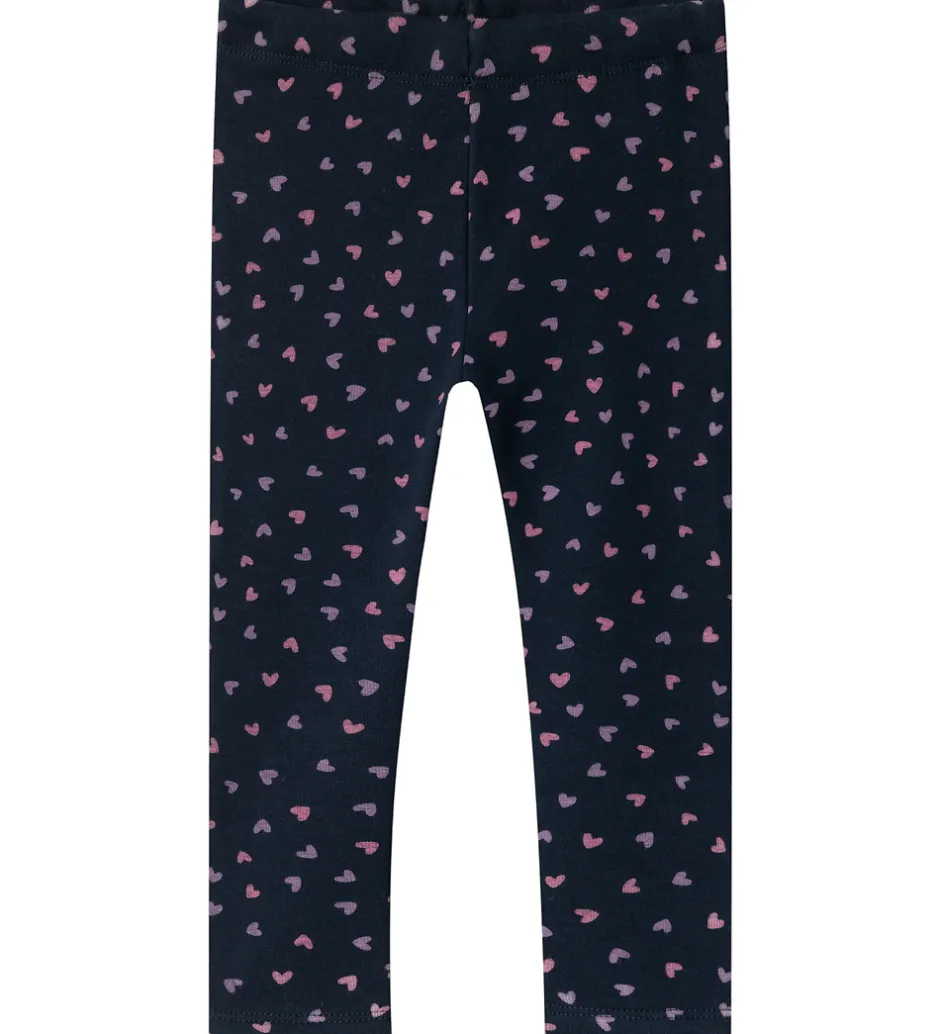 Skønne Name It leggings i en navy sweat med lyserøde og lilla hjerter. Name It leggingsene har en elastisk talje, der sikrer en behagelig pasform, og de har en blød og lækker, børstet inderside.