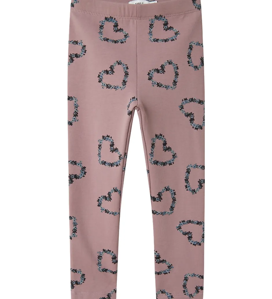 Indbydende Name It leggings i støvet lilla sweat med et print af hjerter lavet af blomsterranker i hvid og lilla nuancer. Leggingsene har lange ben, og i livet er der en smal elastikkant. Leggingsene har blødt, børstet bomuld på indersiden.