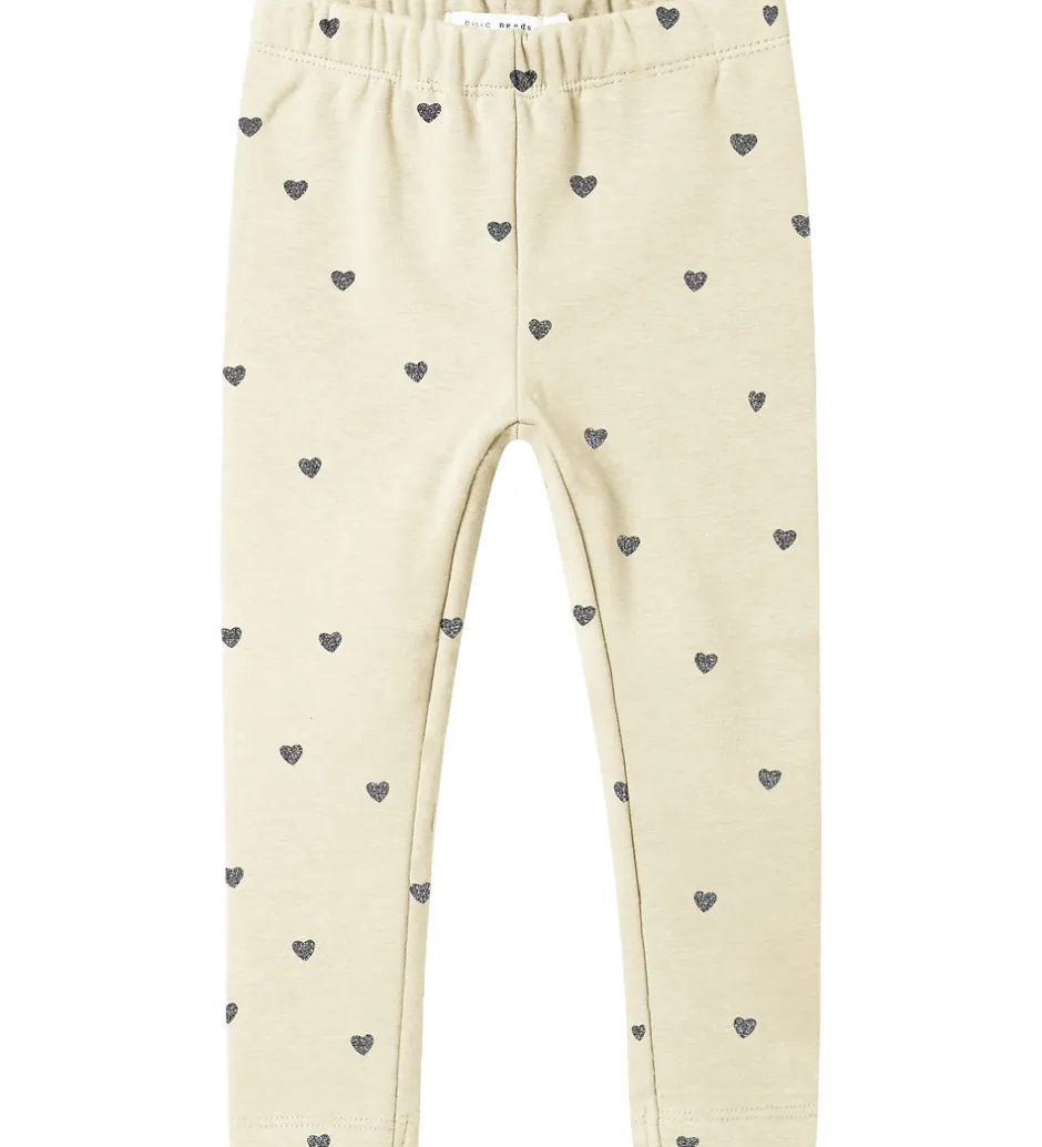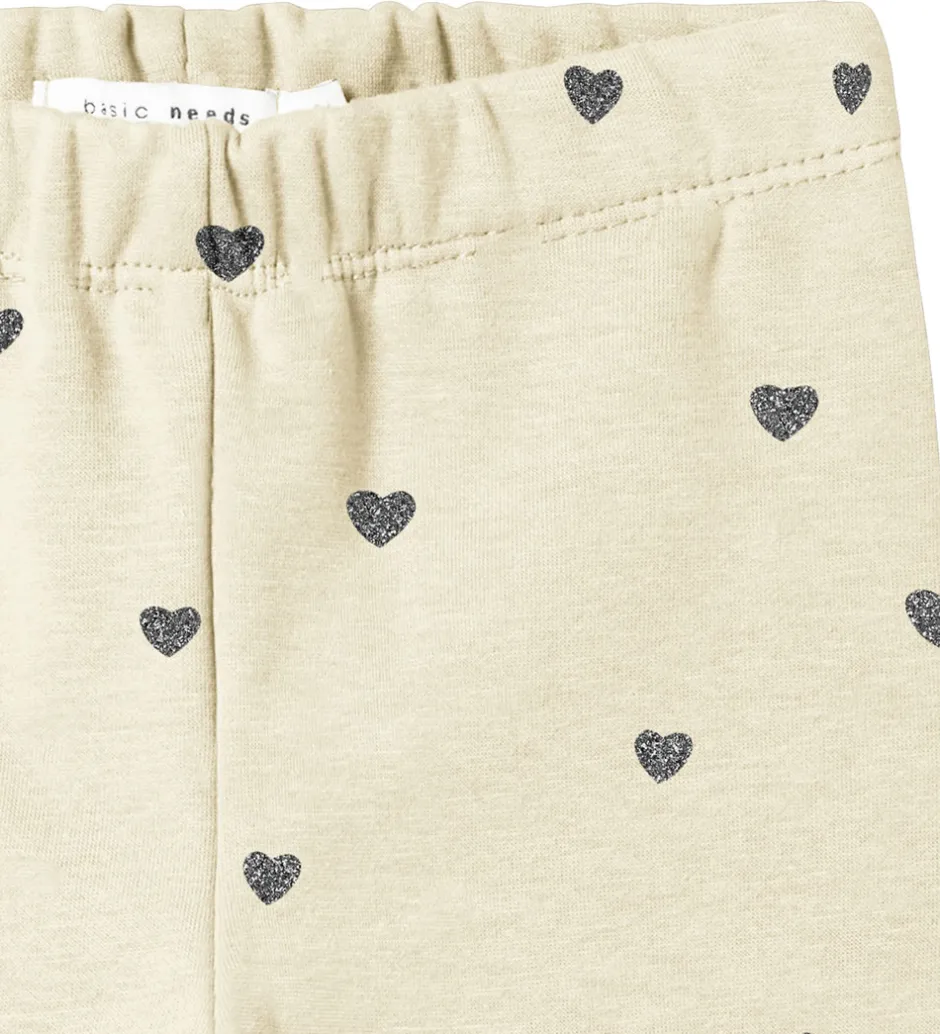 Skønne Name It leggings i en lys beige farve med små, sølvfarvede hjerter med glimmer. Name It leggingsene har en elastisk talje, der sikrer en behagelig pasform, og på indersiden har de blødt fleece.