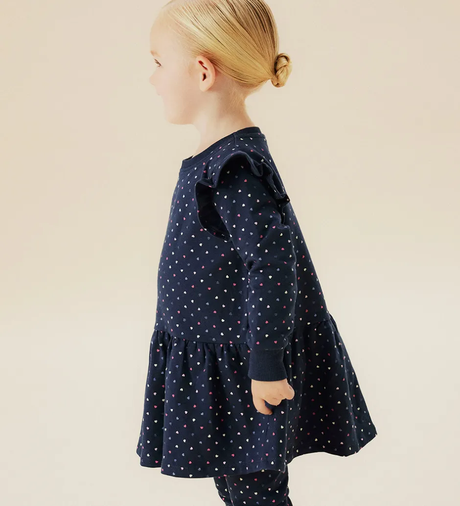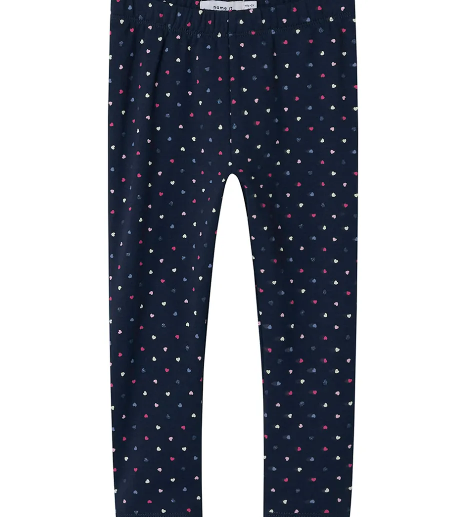 Smarte Name It leggings i mørkeblå med et alloverprint af små hjerter i hvide, rosa og blå nuancer med glimmer. Name It leggingsene har en elastik i taljen og en blød, børstet inderside.
