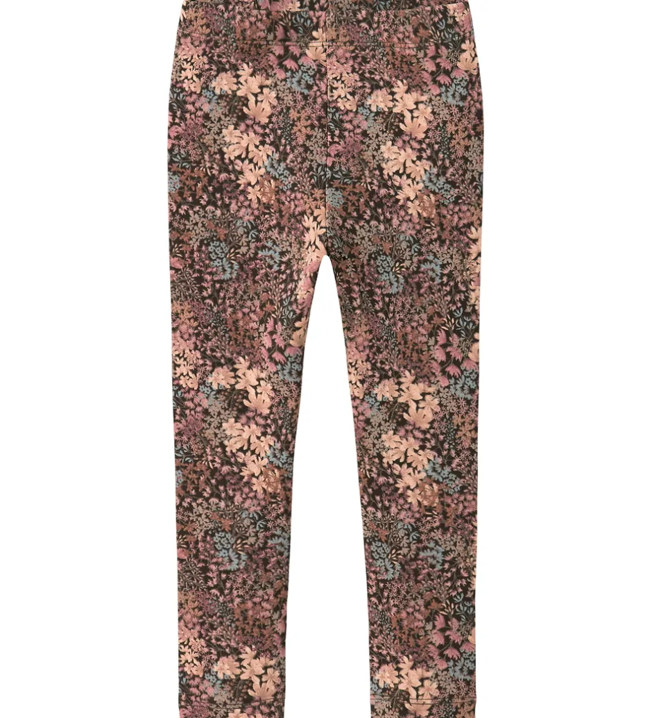 Elegante Name It leggings i mørkebrun med et blomsterprint i primæt rosa og lilla nuancer. Name It leggingsene har en elastisk talje, der sikrer en behagelig pasform.