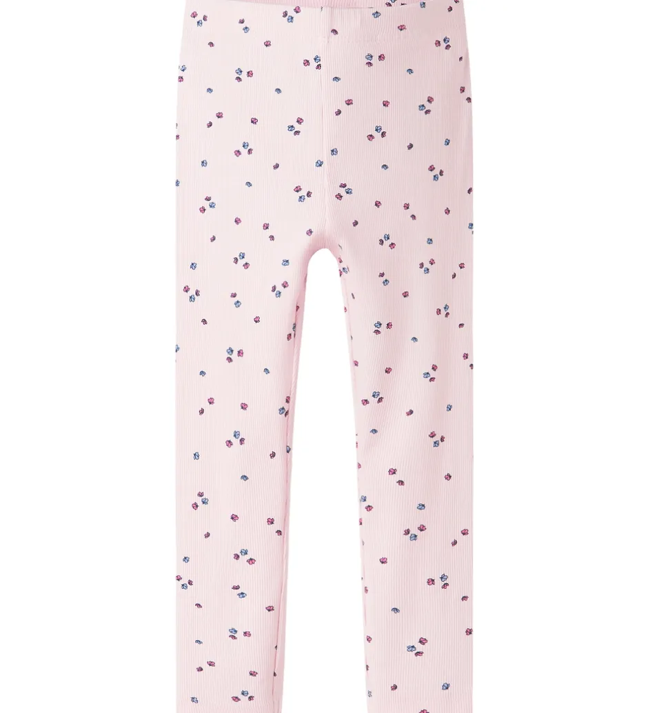 Elegante Name It leggings i en lys, rosa farve med et delikat blomstermønster i pink og blå nuancer. Name It leggings har en elastisk talje og en blød ribstruktur, der giver en behagelig pasform.