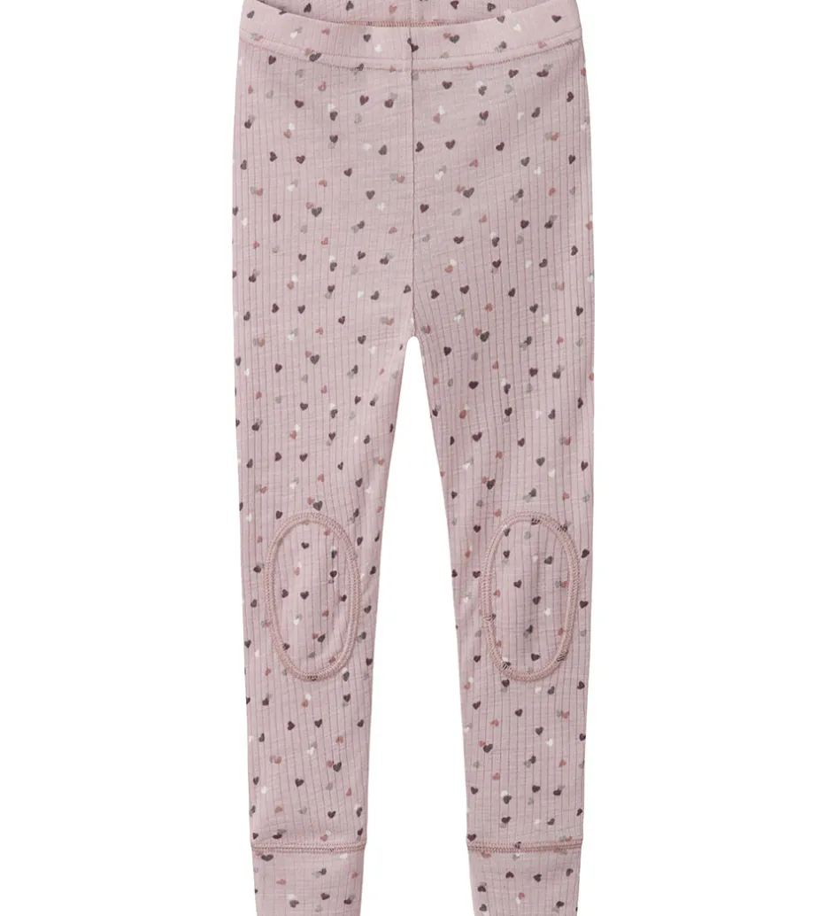Flotte Name It leggings i rosa med et alloverprint af små hjerter i forskellige farver. Legginsene har ribstruktur og dekorative syninger på knæene. De har en god elastik i taljen, og brede ribkanter ved anklerne. Legginsene er fremstillet af merinould og modal.