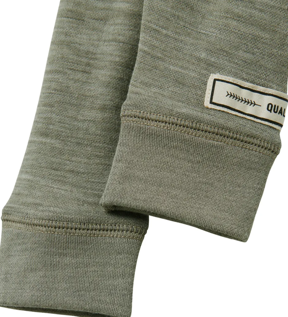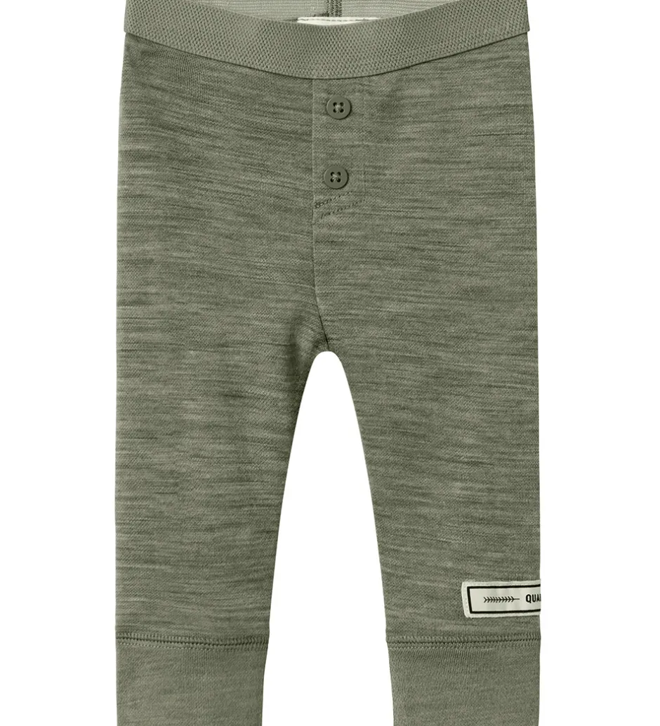 Fine Name It leggings i gråmeleret med dekorative knapper fortil og en hvid applikation nederst på venstre ben. Name It leggingsene har en elastisk talje og ribkanter ved anklerne. Legginsene er fremstillet af merinould og viskose.
