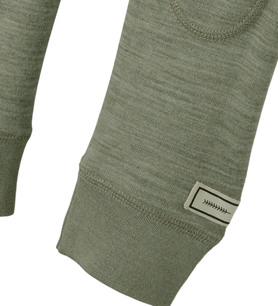 Flotte Name It leggings i meleret grøn med runde syninger på knæene og en hvid applikation nederst på venstre ben. Name It leggingsene har en elastisk talje med dekorative knapper fortil og ribkanter ved anklerne. Legginsene er fremstillet af merinould og viskose.