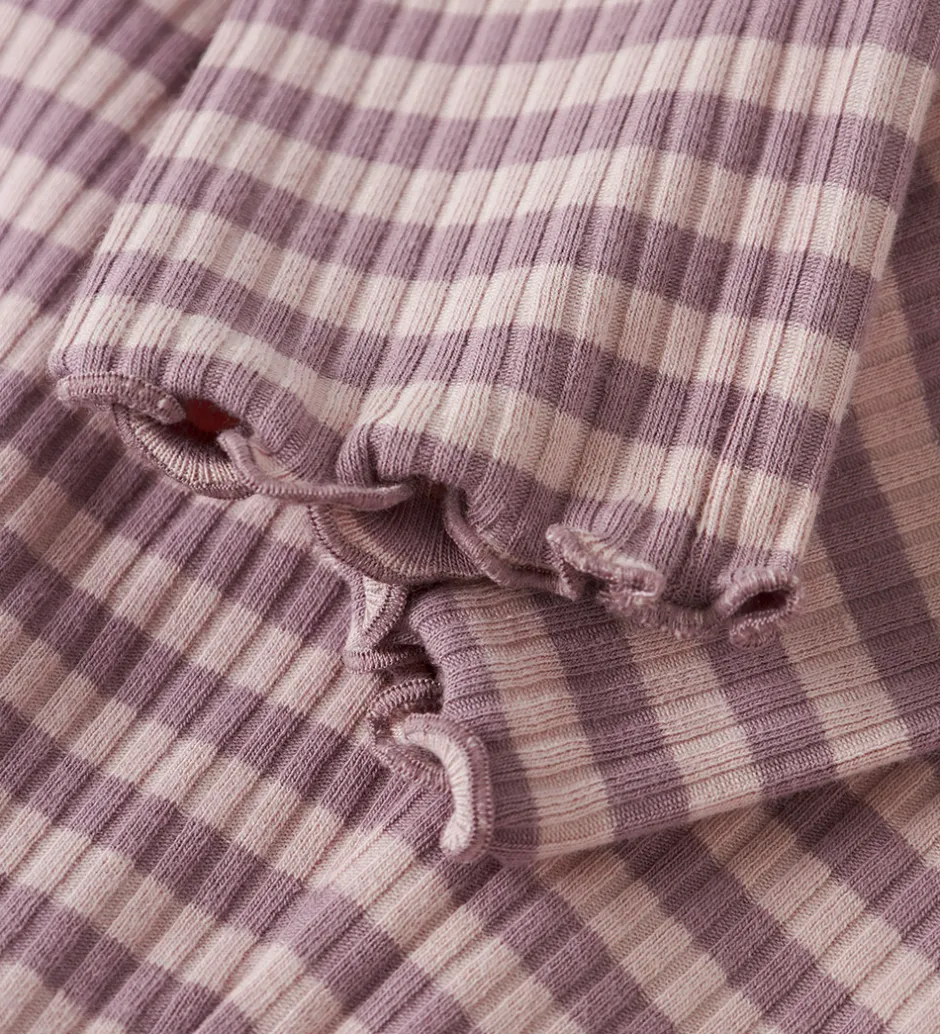 Skønne Name It leggings med striber i to lilla nuancer og ribstruktur. Name It leggingsene har en god elastik i taljen og bølgede kanter ved anklerne.