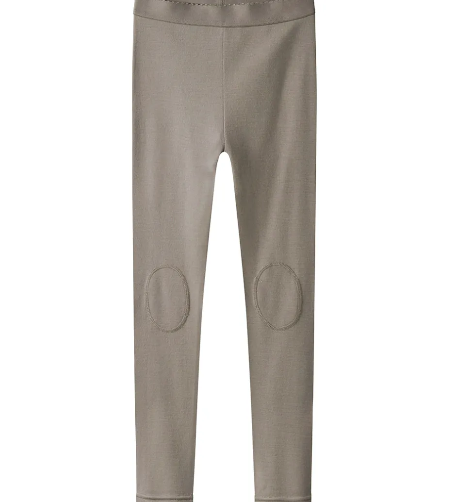 Lækre Name It leggings i gråbrun. Name It leggingsene har en elastisk talje med en fin bølget kant og dekorative syninger på knæene. Leggingsene er fremstillet af blødt merinould.
