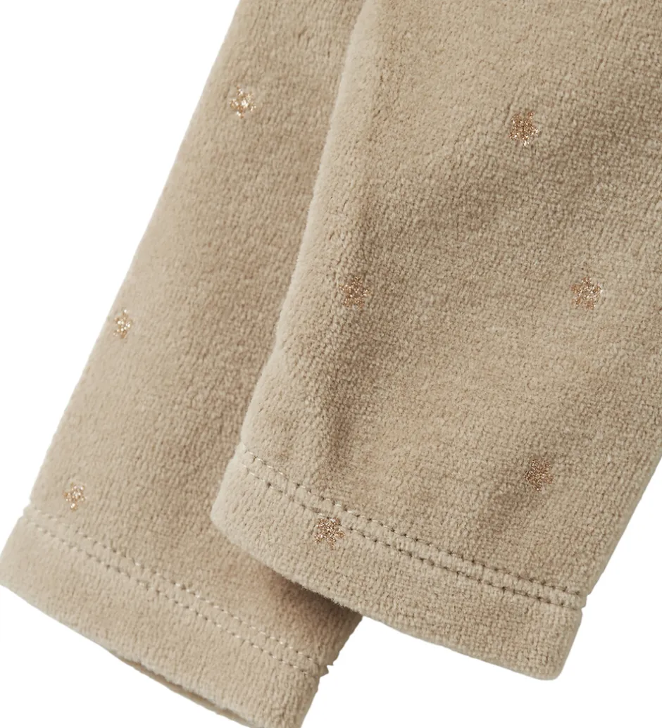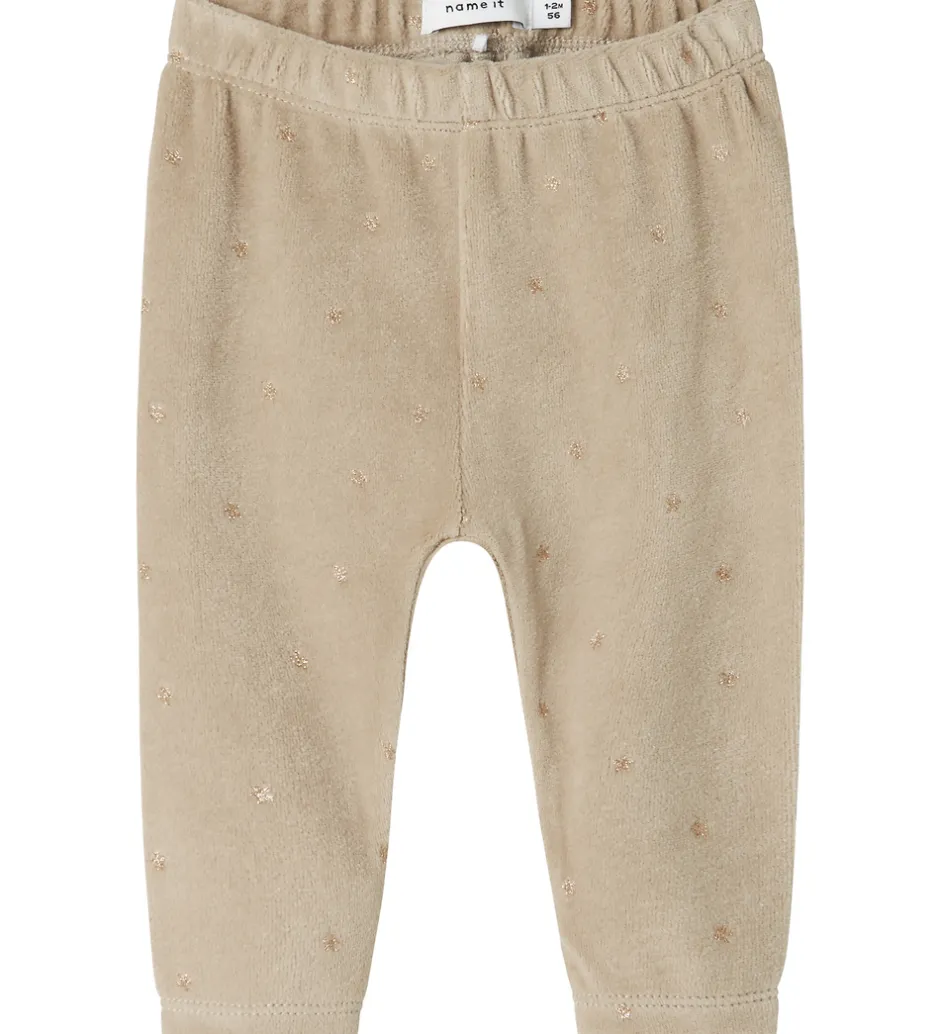 Lækre Name It velourbukser i beige med små stjerner i guld. Bukserne har en tætsiddende pasform med en god elastik i taljen.
