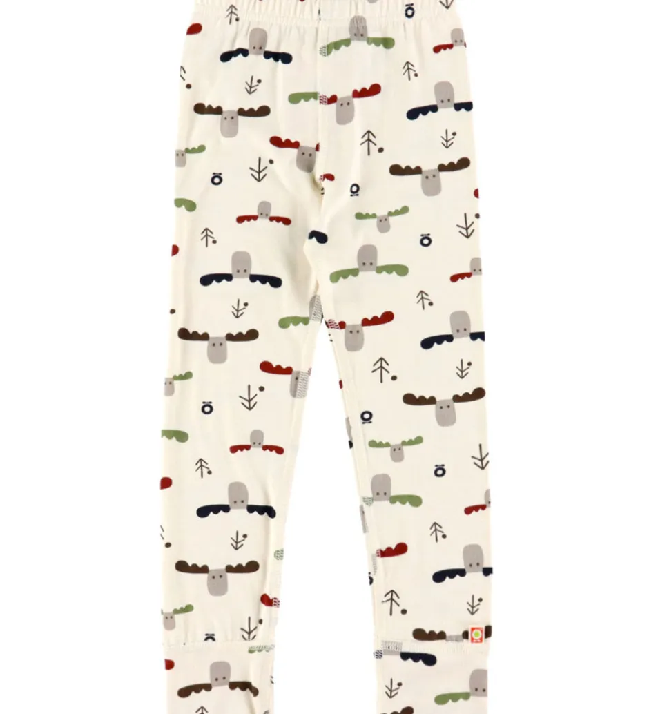 Charmerende Katvig leggings i råhvid med alloverprint af elgehoveder og logoer i forskellige farver. Leggingsene har en elastisk talje og brede ribkanter ved anklerne. De er fremstillet af blødt bambus viskose.