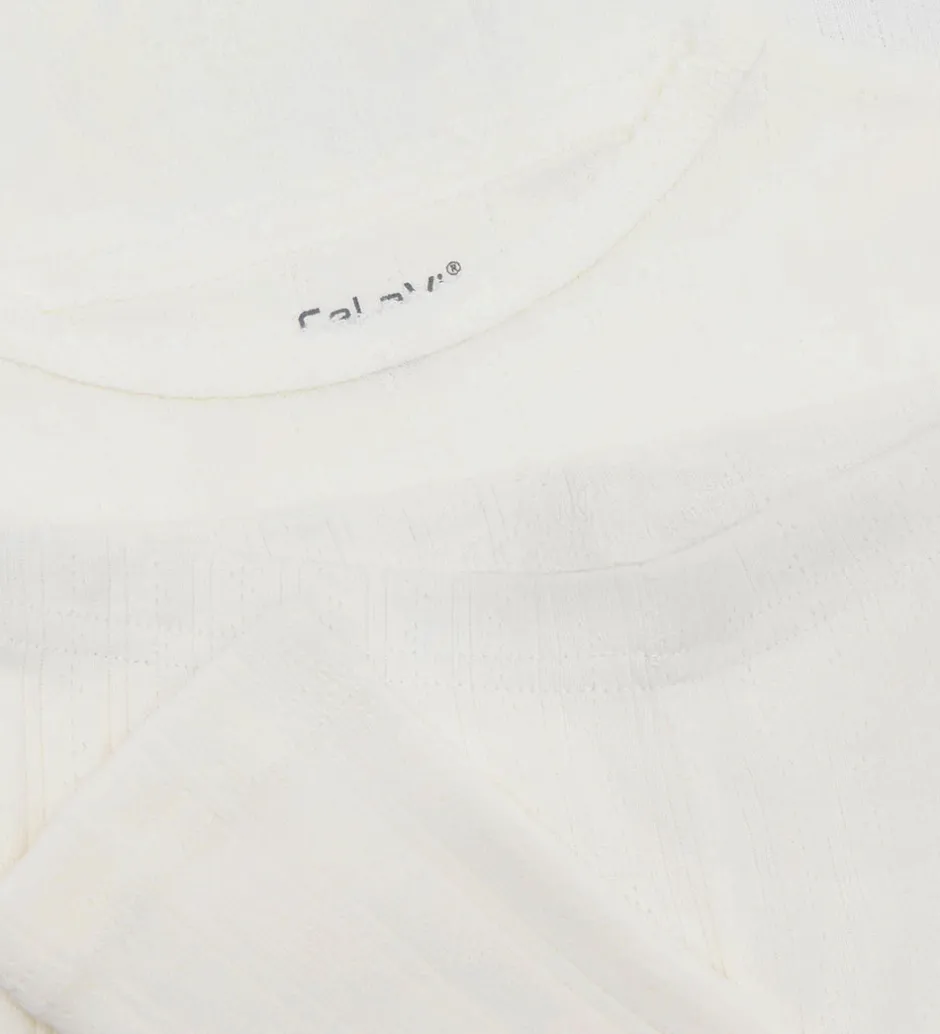 Fint CeLaVi nattøj bestående af en natbluse og et par natbukser i hvid med hulmønster. Natblusen har en rund halsudskæring med en fin kant og lange ærmer. Natbukserne har en god elastikkant i taljen og en tætsiddende pasform.