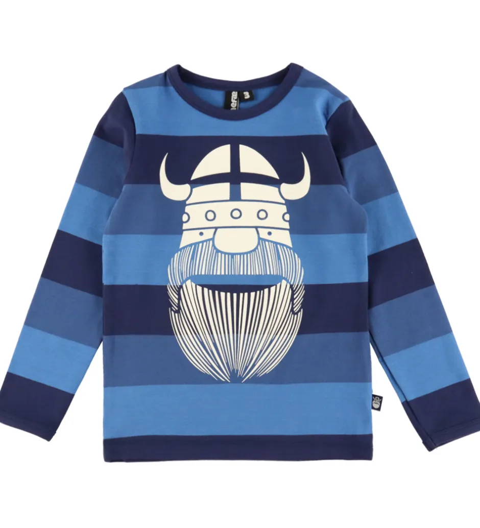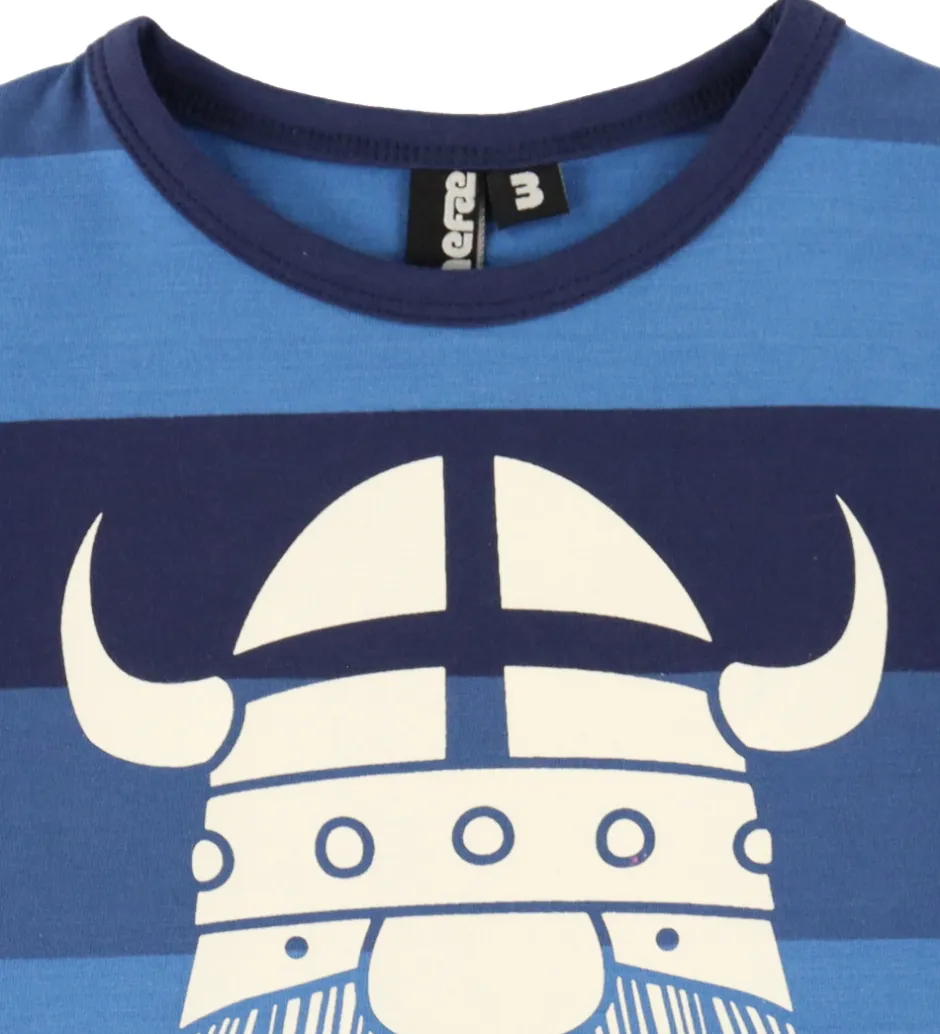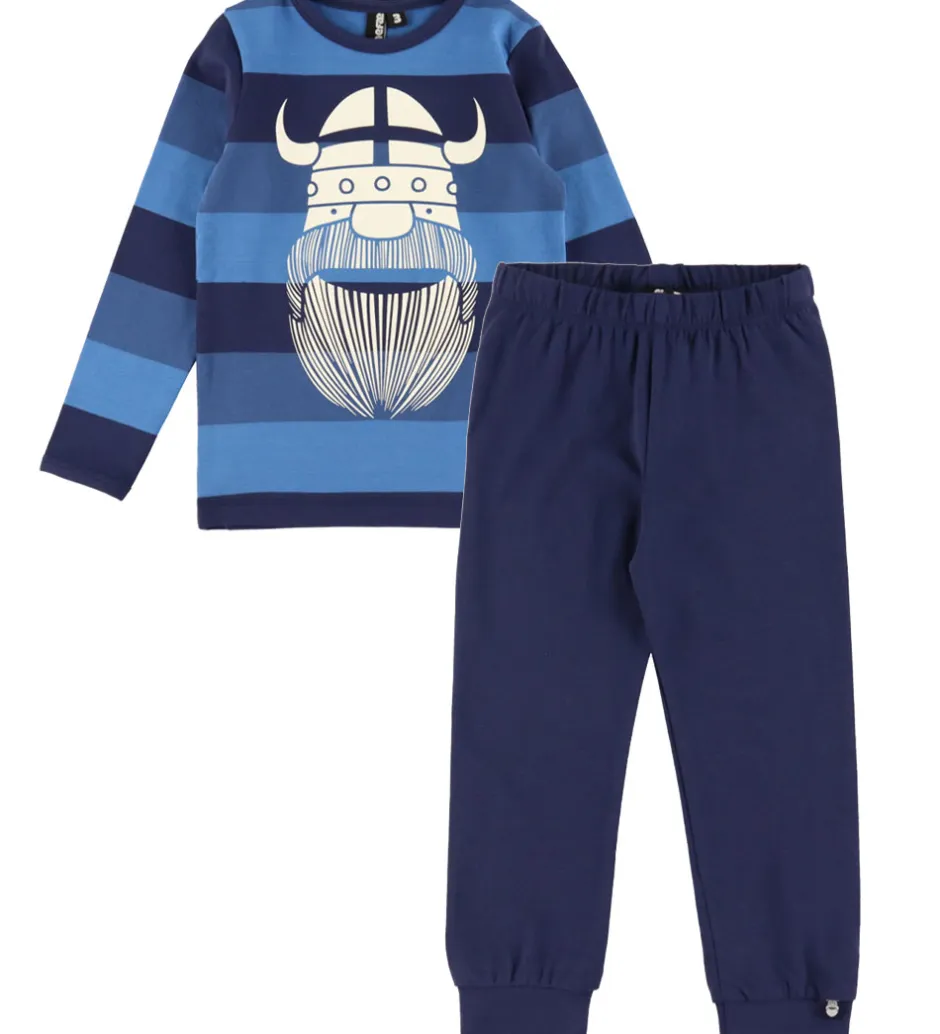 Skønt Danefæ nattøj bestående af en langærmet natbluse med striber i blå nuancer og et stort, hvidt vikingelogo på fronten samt et par navyblå natbukser. Natblusen har en rund halsudskæring og lange ærmer. Natbukserne har en god elastik i taljen og brede ribkanter ved anklerne.