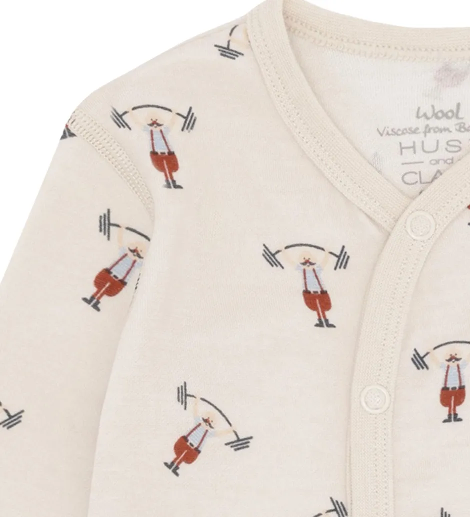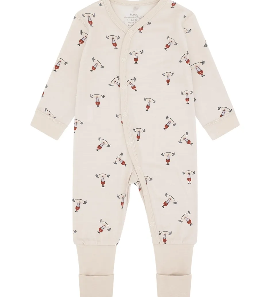 Sjov Hust and Claire natdragt i lys beige med et alloverprint af små vægtløftere. Natdragten har lange ærmer og lukkes foran med praktiske trykknapper fra hagen til venstre fod. Natdragten har lange ben med brede ribkanter og mulighed for ombuk til lukkede fødder. Den er fremstillet i en blød kvalitet af uld og bambus viskose.