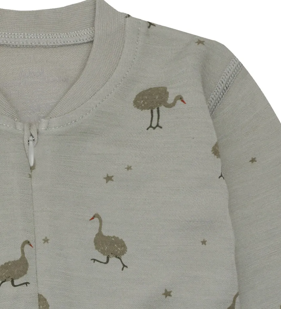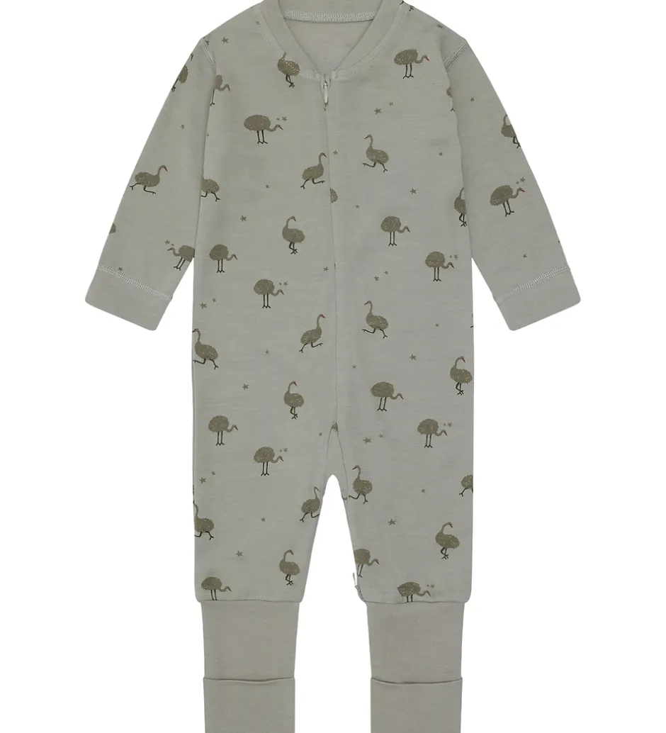 Smart Hust and Claire natdragt i støvet grøn med et alloverprint af strudser og små stjerner i grønne nuancer. Natdragten har lange ærmer og lukkes foran med en skjult lynlås. Natdragten har lange arme og lange ben med brede ribkanter og mulighed for ombuk til lukkede fødder. Den er fremstillet i en blød kvalitet af uld og bambus viskose.