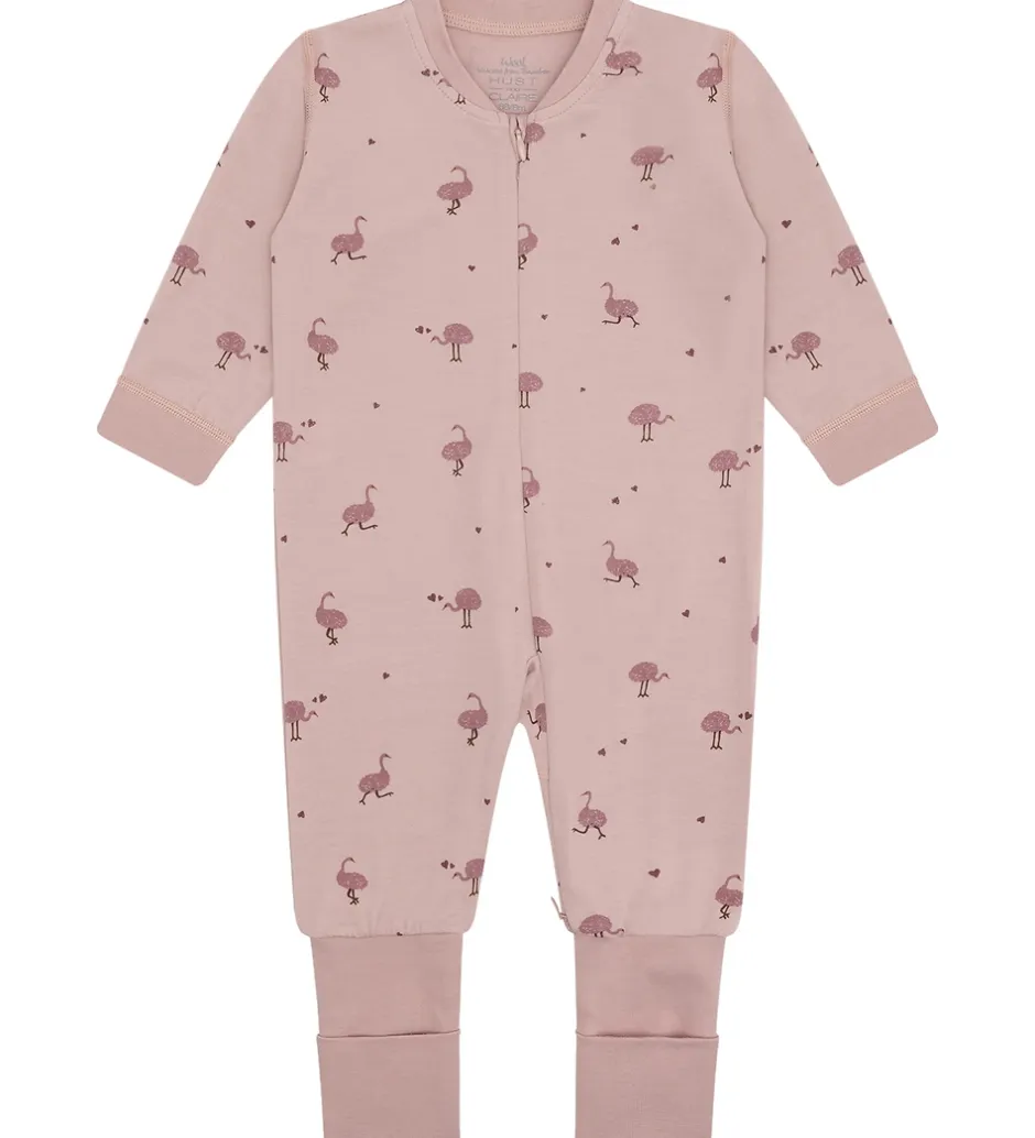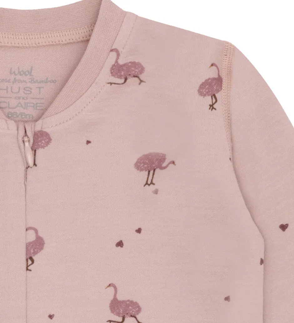 Sød Hust and Claire natdragt i støvet rosa med et alloverprint af strudser og små hjerter i mørk rosa. Natdragten har lange ærmer og lukkes foran med en skjult lynlås. Natdragten har lange arme og lange ben med brede ribkanter og mulighed for ombuk til lukkede fødder. Den er fremstillet i en blød kvalitet af uld og bambus viskose.