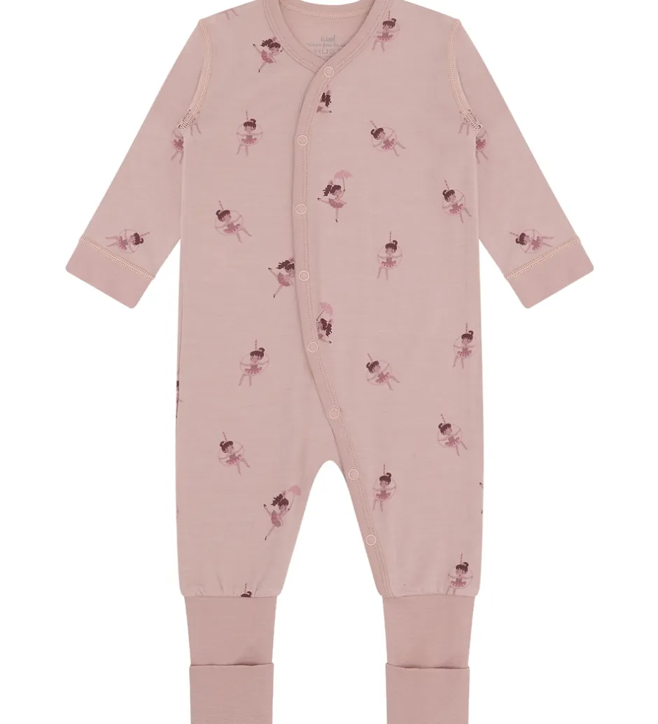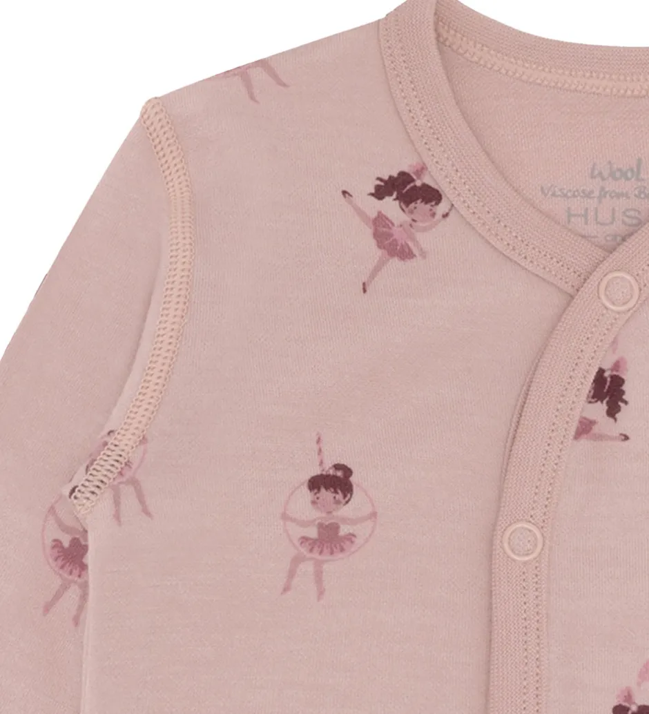 Charmerende Hust and Claire natdragt i rosa med et sødt ballerina-print. Natdragten har lange ærmer og lukkes foran med praktiske trykknapper fra hagen til venstre fod. Natdragten har lange ben med brede ribkanter og mulighed for ombuk til lukkede fødder. Den er fremstillet i en blød kvalitet af uld og bambus viskose.
