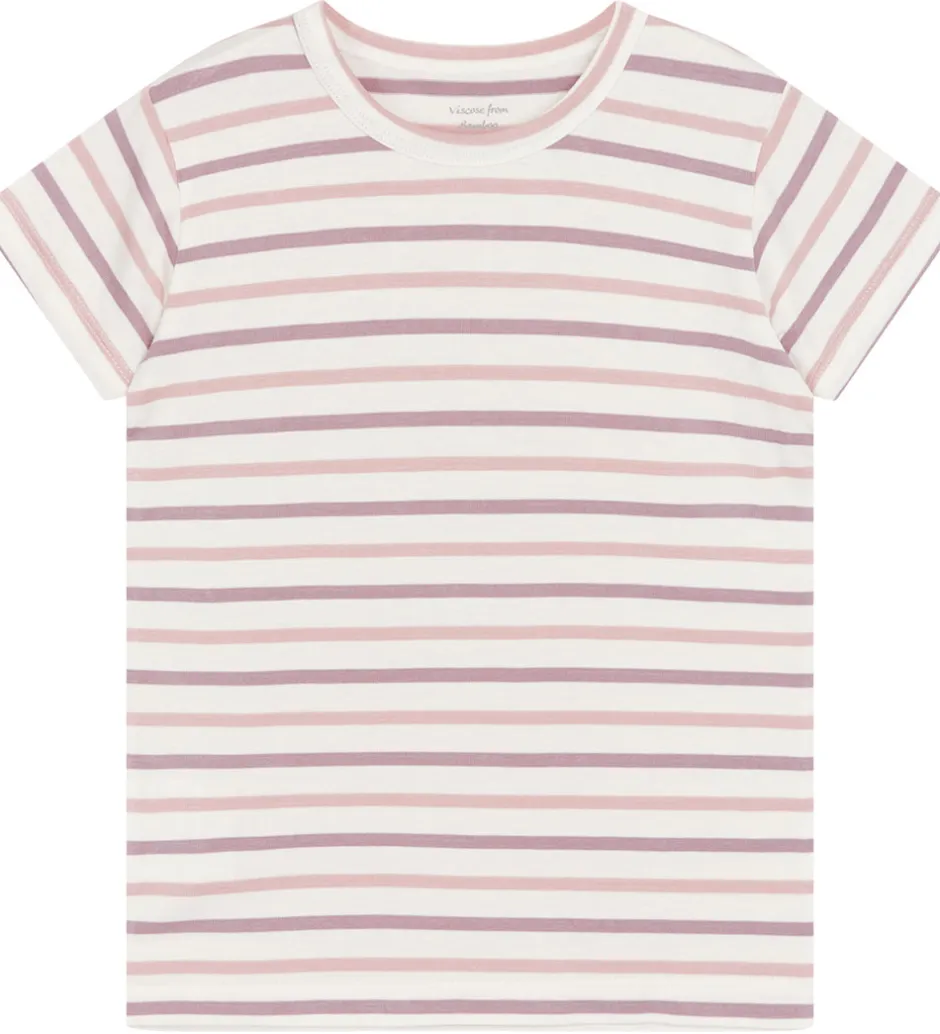 Lækker Hust and Claire t-shirt i en lys beige nuance med striber i rosa og lys lilla. T-shirten har et enkelt design, der gør den tidløs og let at kombinere med øvrige garderobe.