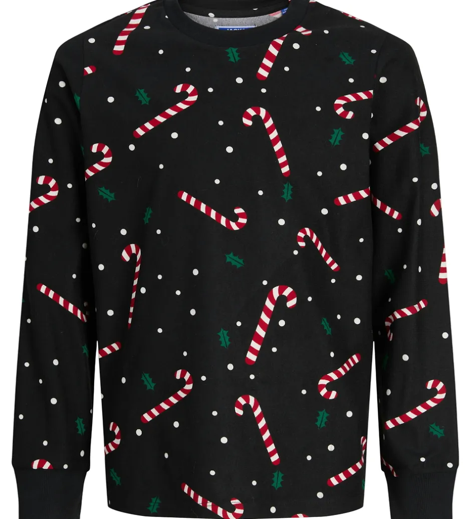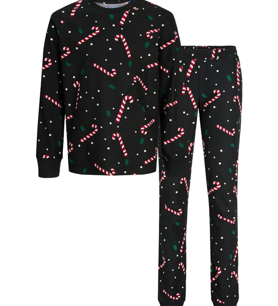 Flot Jack & Jones nattøj i sort med et festligt juleprint af sukkerrør og snefnug. Natblusen har lange ærmer mens natbukserne har en elastisk talje, der passer perfekt til nattens hygge.