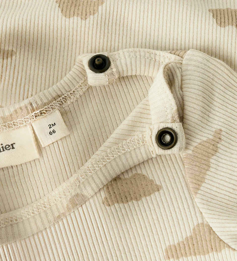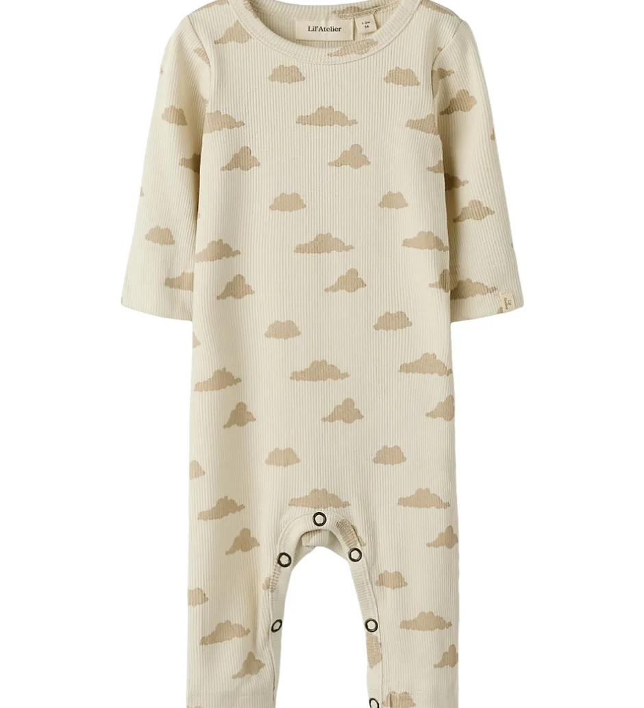 Charmerende natdragt fra Lil Atelier i beige med et skyprint i brun. Natdragten har ribstruktur, lange ærmer og lange ben. Den lukkes med trykknapper ved venstre skulder og mellem benene.
