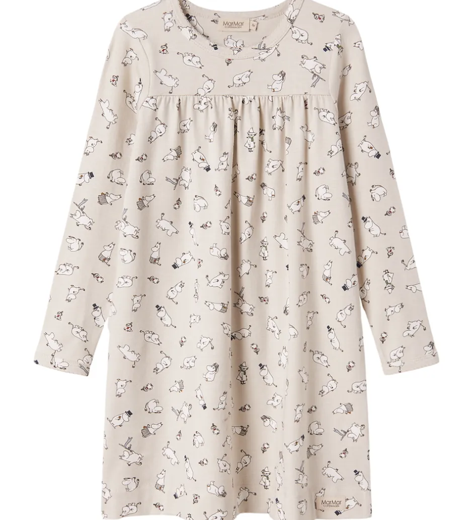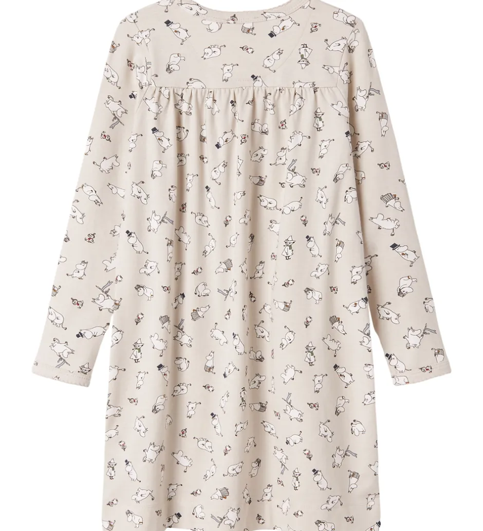 Lækker MarMar natkjole i en blød, gråbeige nuance med et fint alloverprint af Moomins-figurer.
