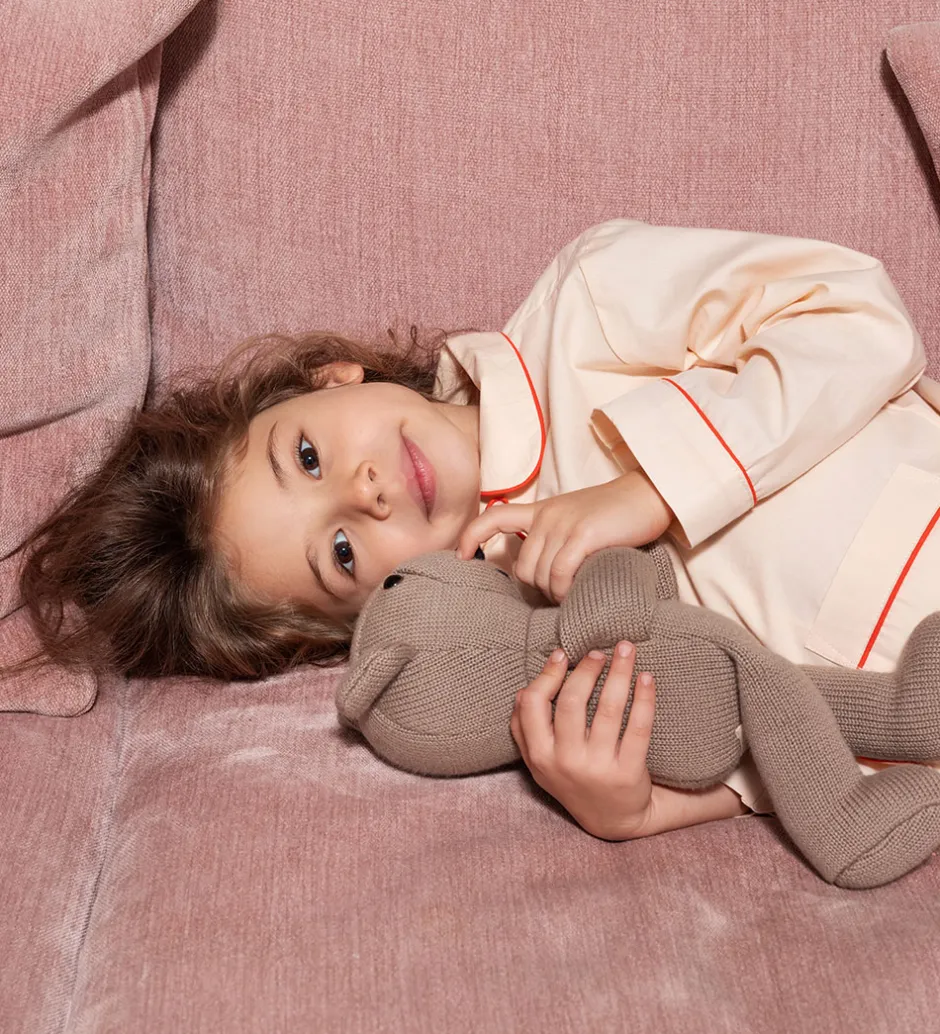 Elegant MarMar nattøj bestående af en natskjorte og et par natbukser. Nattøjet er i en lys, rosabeige nuance med røde detaljer. Natskjorten har fine knapper foran, og natbukserne har en komfortabel elastisk talje, begge med smukke røde kantlinjer.