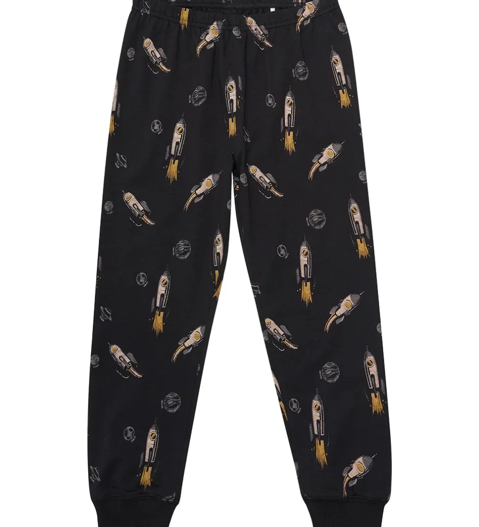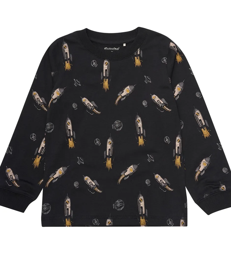 Dejligt Minymo nattøj 2-delt sæt i sort med et fantasifuldt rumskibsprint over det hele. Minymo blusen har lange ærmer, mens bukserne har en komfortabel pasform, begge med elastiske kanter.