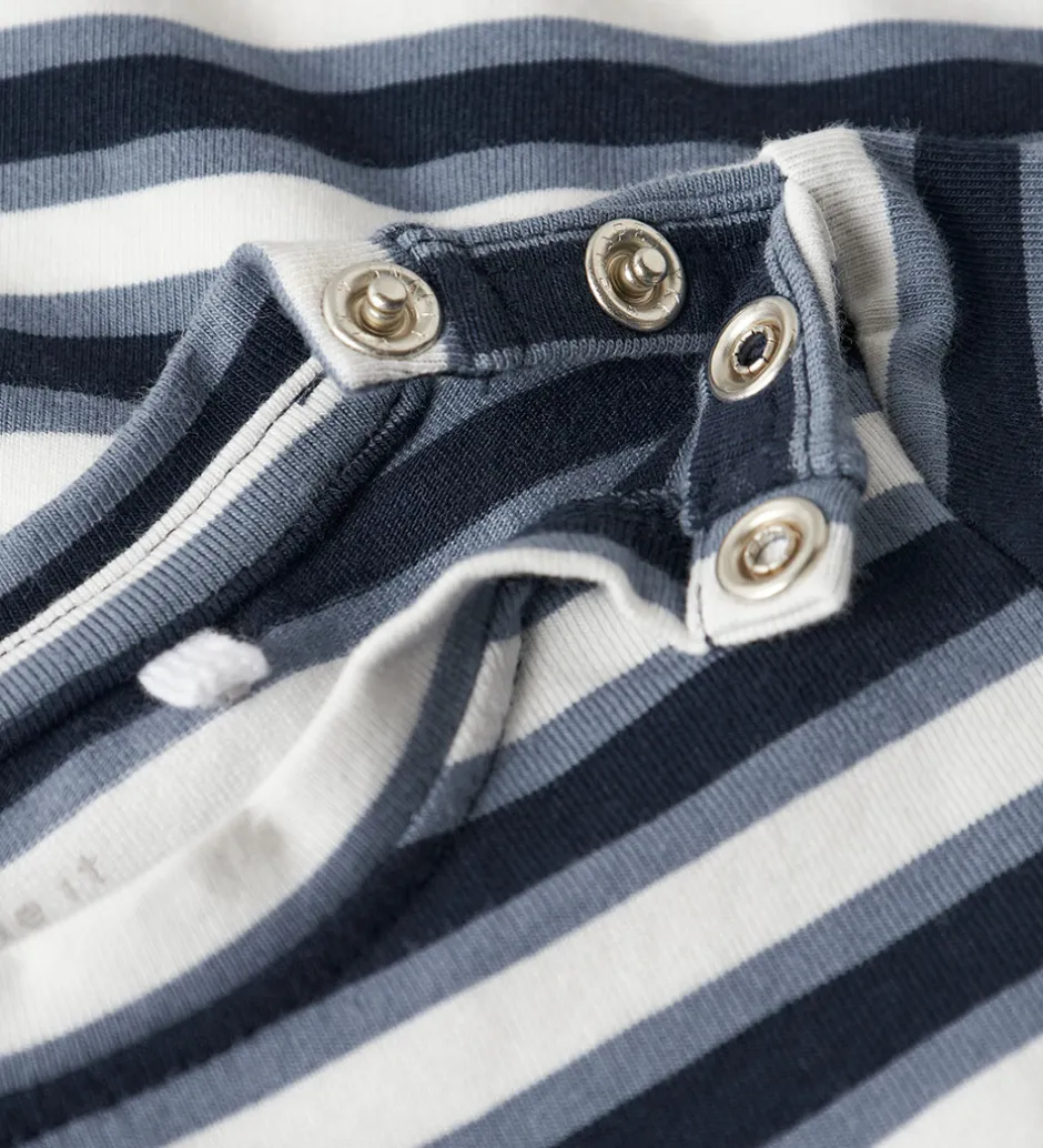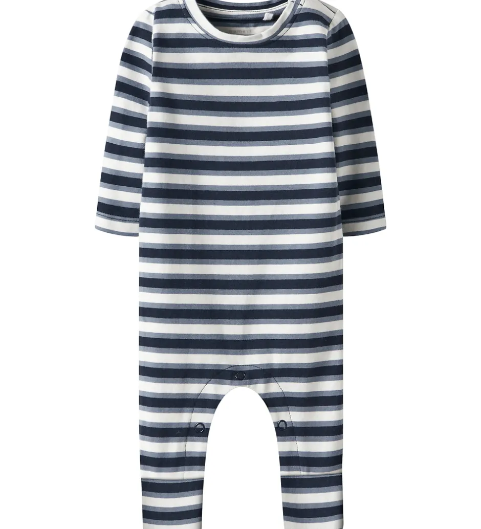 Skøn Name It natdragt i stribet navyblå, støvet blå og hvid. Natdragten har lange ærmer og lange ben med mulighed for ombuk til lukkede fødder. Den lukkes med trykknapper ved venstre skulder og mellem benene.