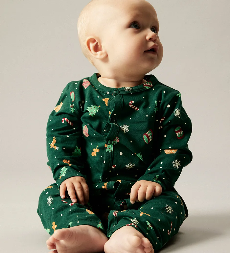Flot natdragt fra Name It i mørkegrøn med et festligt juleprint. Natdragten har lange ærmer og en rund halsudskæring. Den lukkes fortil med trykknapper fra hagen til venstre fod.