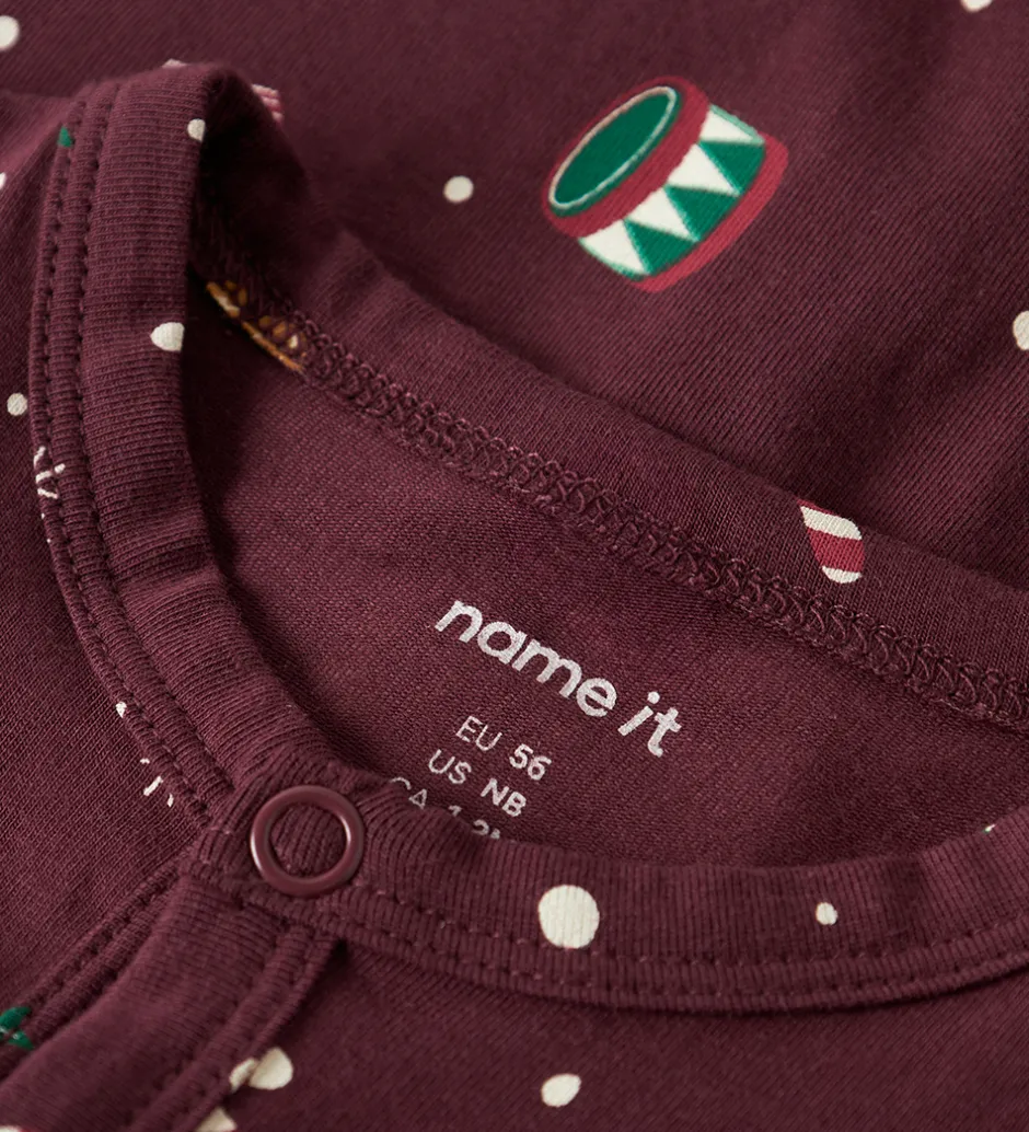 Fin natdragt fra Name It i mørkerød med et festligt juleprint. Natdragten har lange ærmer og en rund halsudskæring. Den lukkes fortil med trykknapper fra hagen til venstre fod.