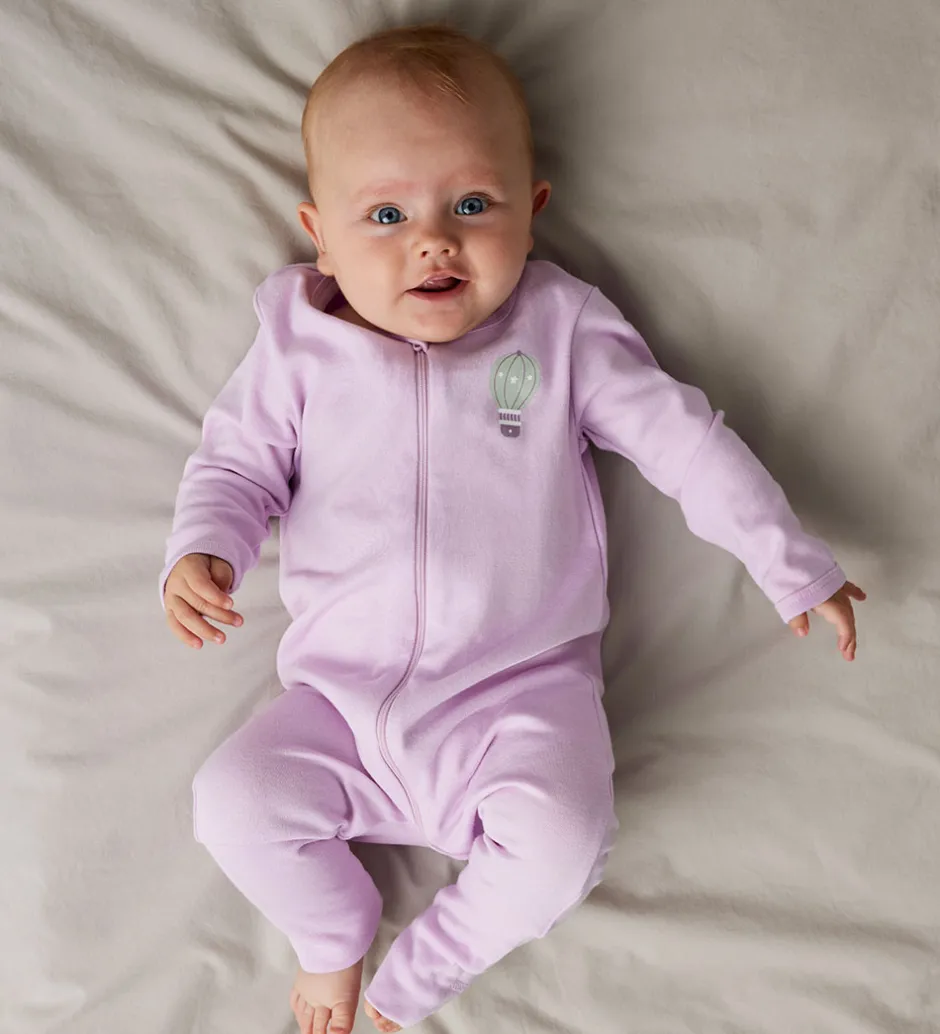 - Ensfarvet rosa med et print af en grøn og lilla luftballon på venstre bryst