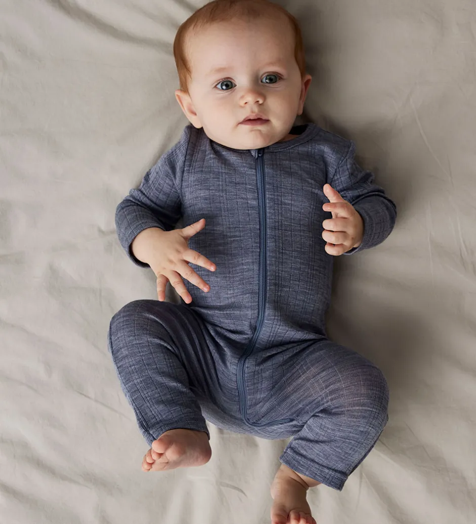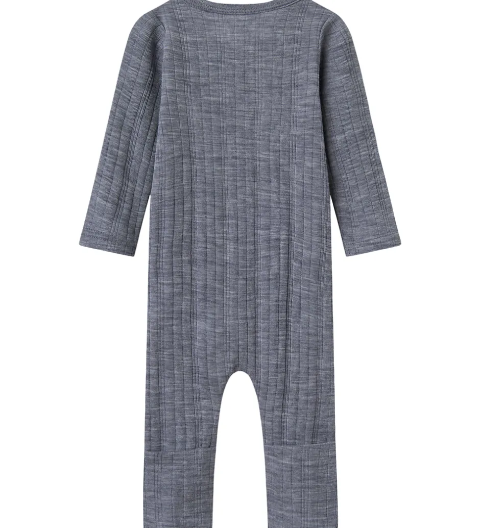 Stilfuld Name It natdragt i en klassisk gråblå med et enkelt ribbet mønster. Natdragten er designet med en praktisk lynlås med hagebeskytter, hvilket gør den nem at tage af og på. Den har lange ærmer og er perfekt til at holde dit barn varmt i de kølige nætter. Natdragten er fremstillet af lækkert merinould.
