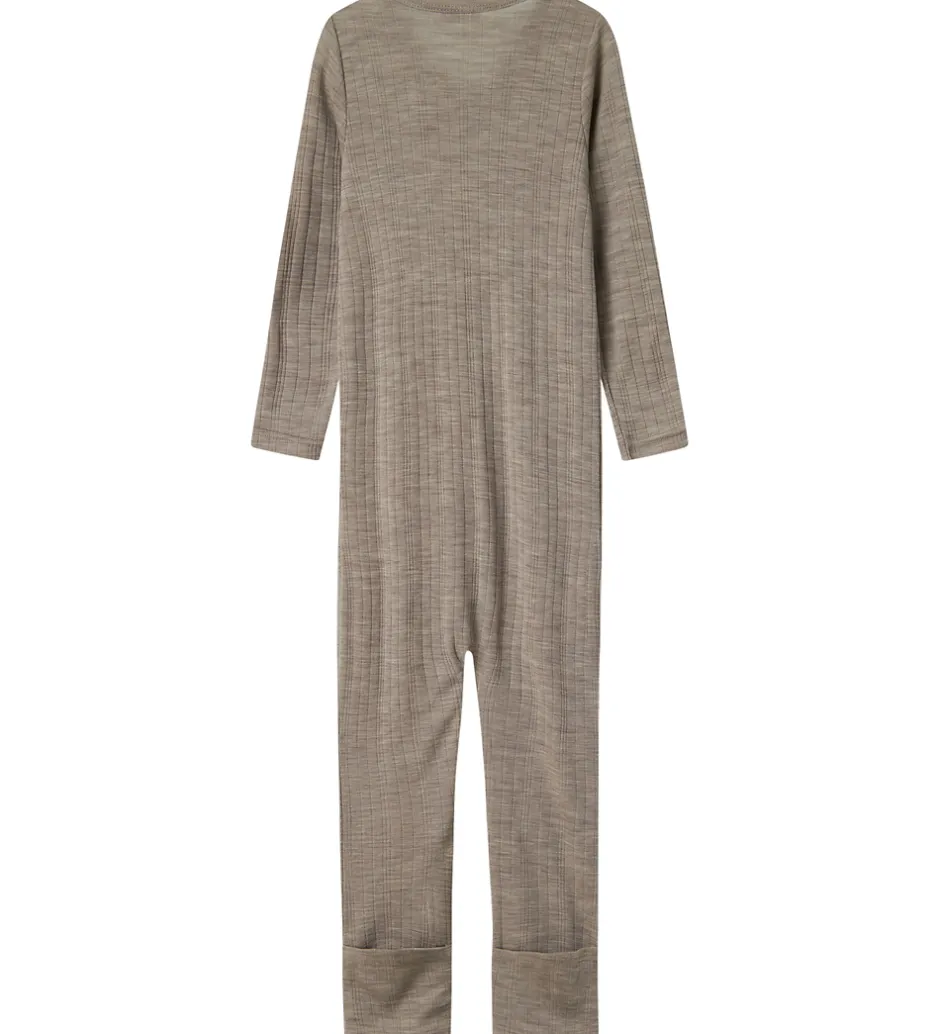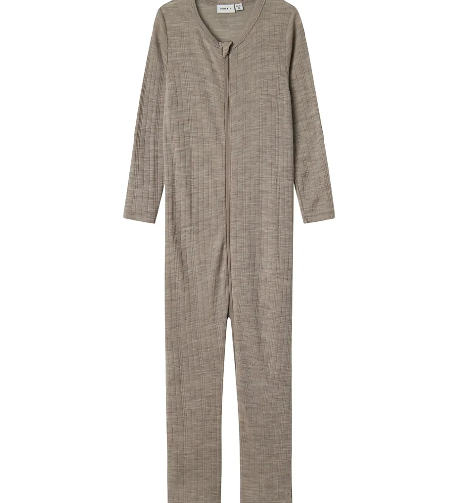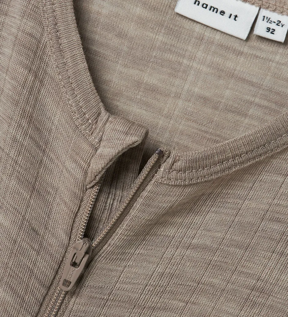 Elegant Name It natdragt i gråbeige med fin ribstruktur. Natdragten har en rund halsudskæring og lynlås fortil med hagesbeskytter og indvendig vindstolpe. Natdragten har lange ærmer og lange ben med mulighed for ombuk til lukkede fødder. Den er fremstillet i blødt og åndbart merinould.