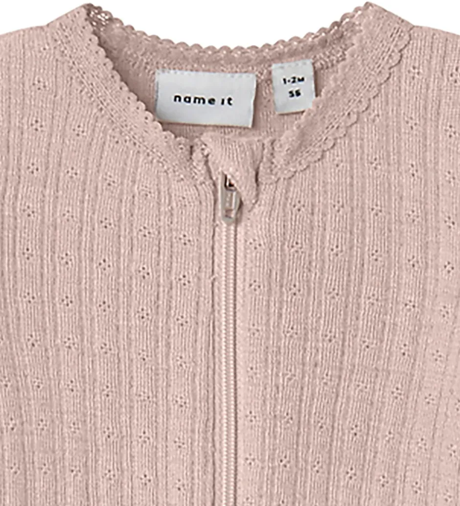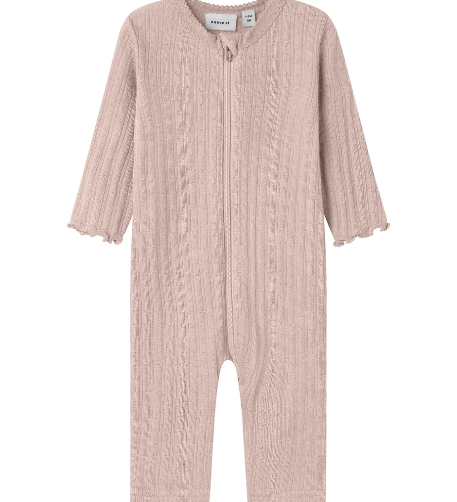 Natdragten har en delikat ribstruktur med små hulmønstre og bølgede kanter ved ærmer og halsudskæring. Der er en praktisk lynlås foran, der gør det nemt at tage natdragten af og på, samt ombuk ved fødderne.