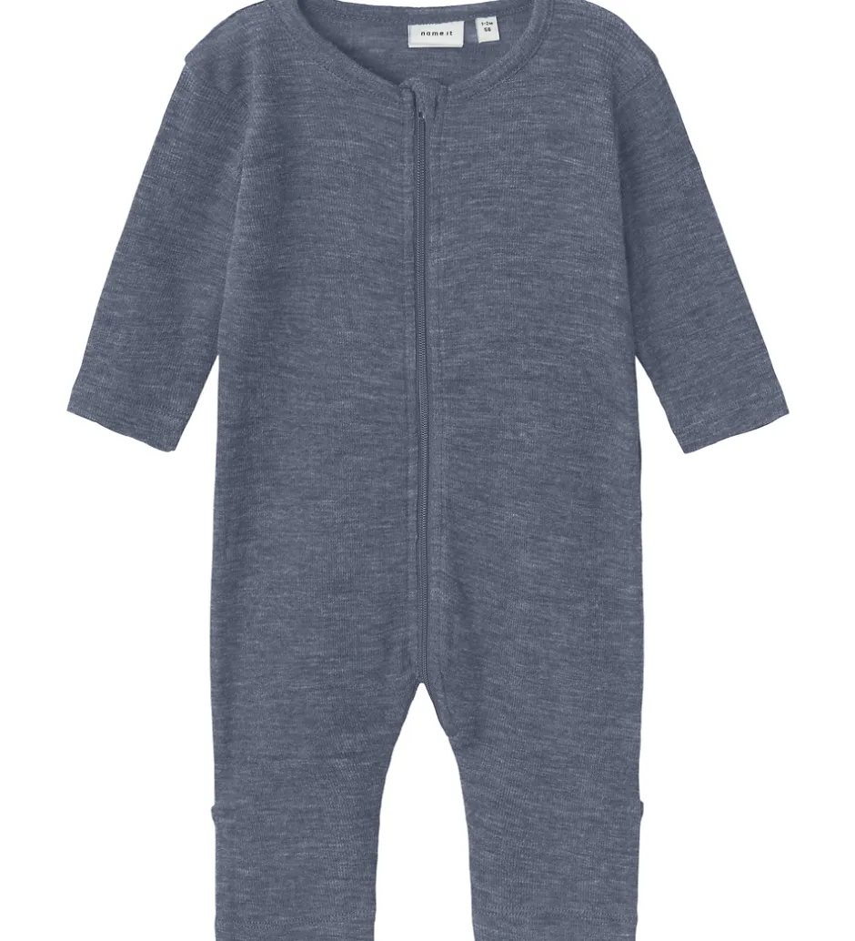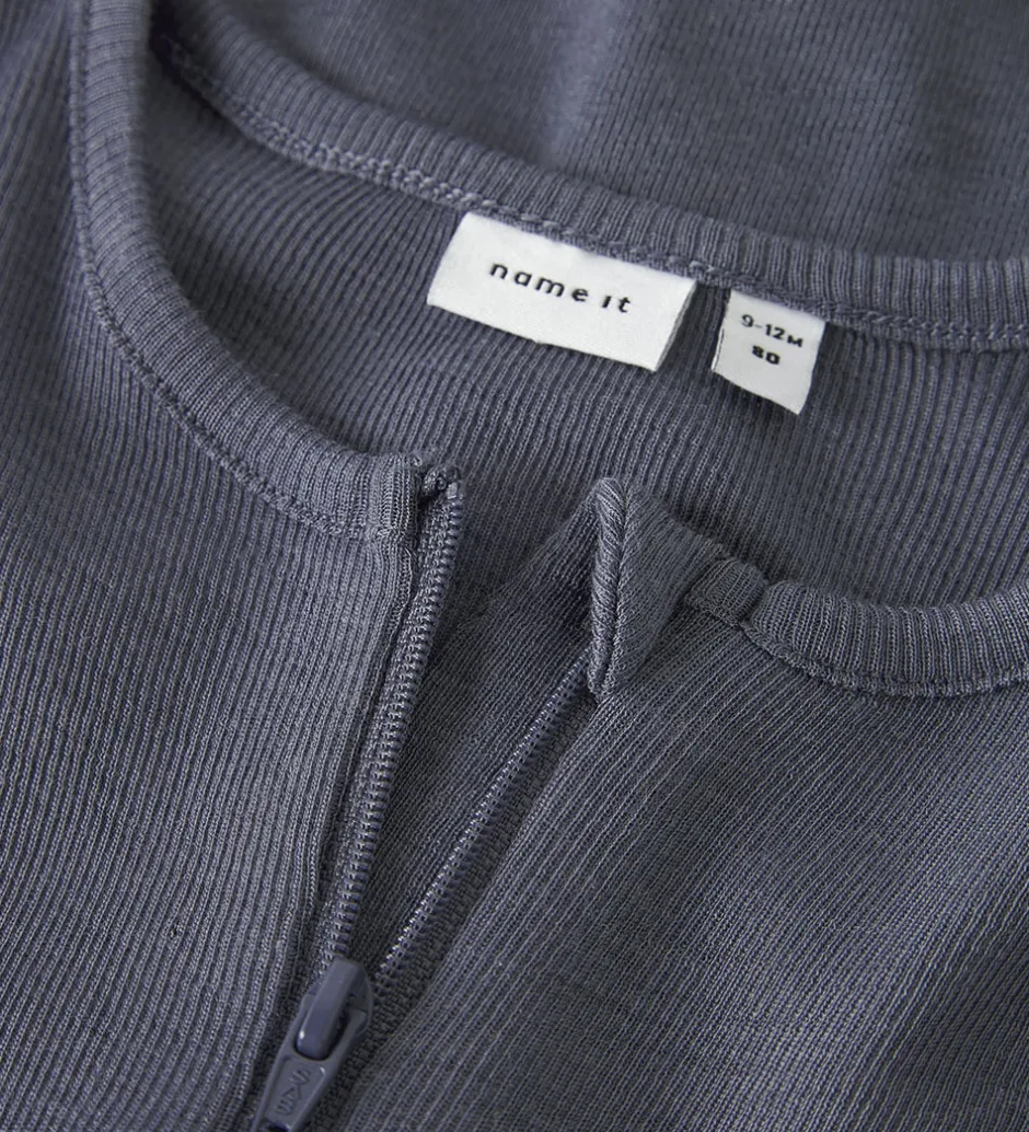 Praktisk Name It natdragt i en ensfarvet, blå nuance med ribstruktur. Natdragten har lange ærmer og ben med ombuk, samt en gennemgående lynlås på fronten, der gør den nem at åbne og lukke.