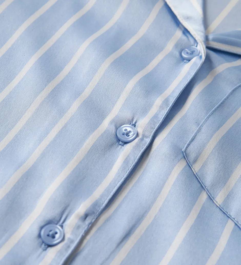 Flot Name It natskjorte i blå satin med hvide striber. Natskjorten har en skjortekrave og gennemgående knapper. Fortil er der en smart brystlomme. Natskjorten er fremstillet i en let og behagelig kvalitet.
