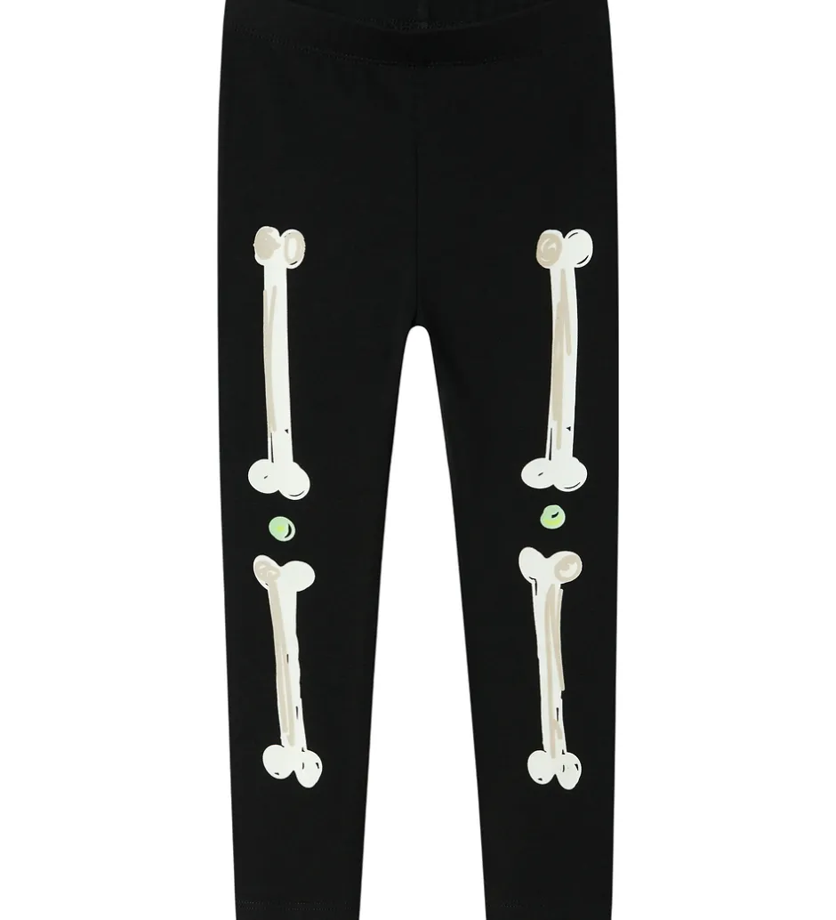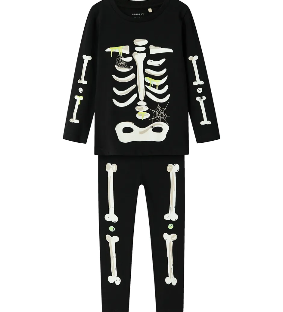 Flot Name It nattøj sæt i sort med lange ærmer og bukseben og et iøjnefaldende skeletprint, der lyser i mørke. Name It nattøjet består af en en natbluse og et par natbukser. Nattøjet fra Name It er i et halloween-tema.