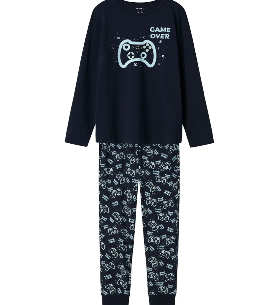 Skønt Name It nattøj, som er 2-delt med en natbluse i navyblå med et gaverprint på fronten samt et par natbukser i navyblå med et allover-gamerprint, der sikrer en god nat.
