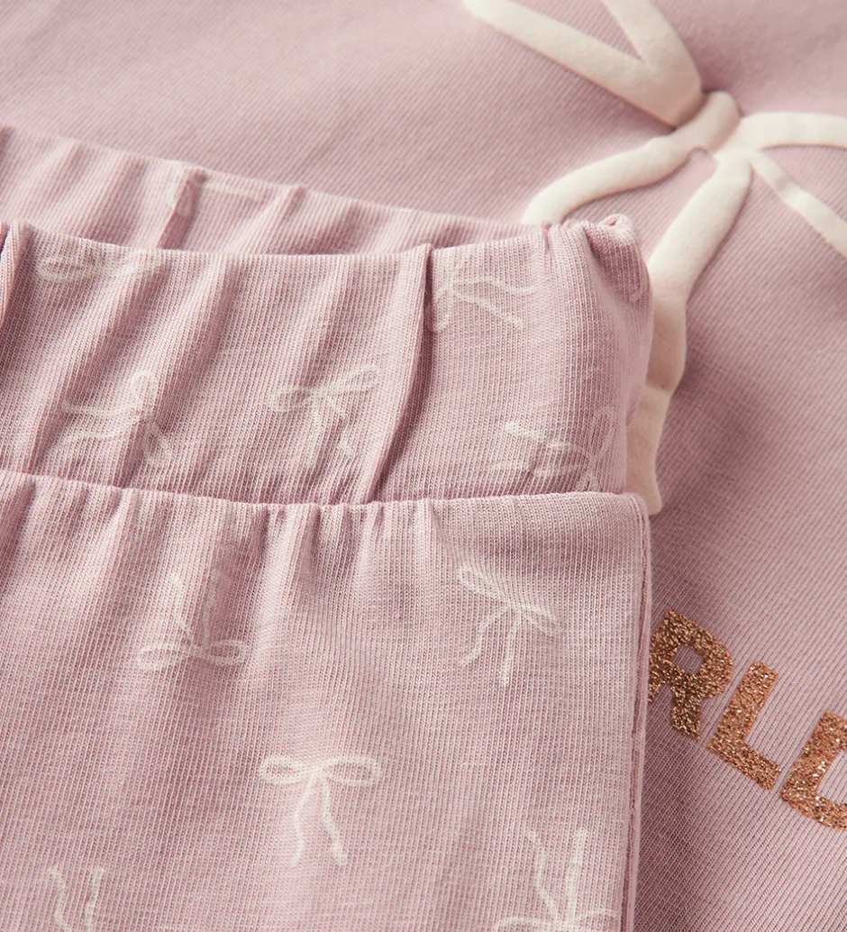 Skønt Name It nattøj 2-delt sæt i en smuk lyserød nuance. Blusen har lange ærmer og et charmerende print med teksten “Off To My Dream World” i guld. Bukserne er dekoreret med små sløjfeprint.